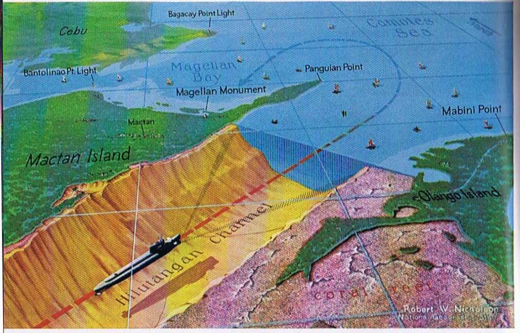 114k | The Triton (SSRN-586) threaded Hilutangan channel off Mactan Island, the Philippines, with sonar feelers. | Photo from the book Great Adventures with National Geographic, 1963. Page 142. | |