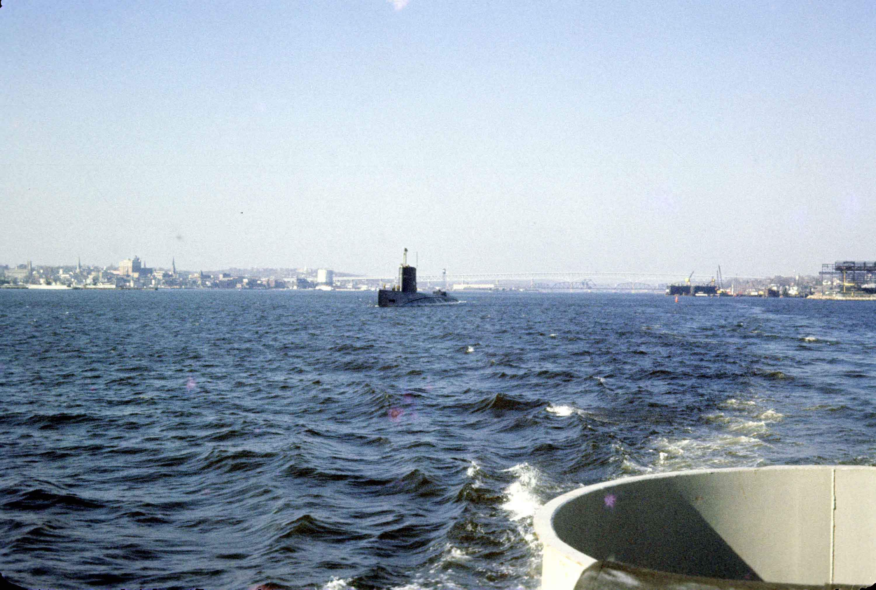 40k | The inactivated Triton (SSRN-586) is shown here being moved from Norfolk VA, on her way to Bremerton, Washington in August 1983. | Photo courtesy of Garry Gray via Ron Reeves (of blessed memory). | |
