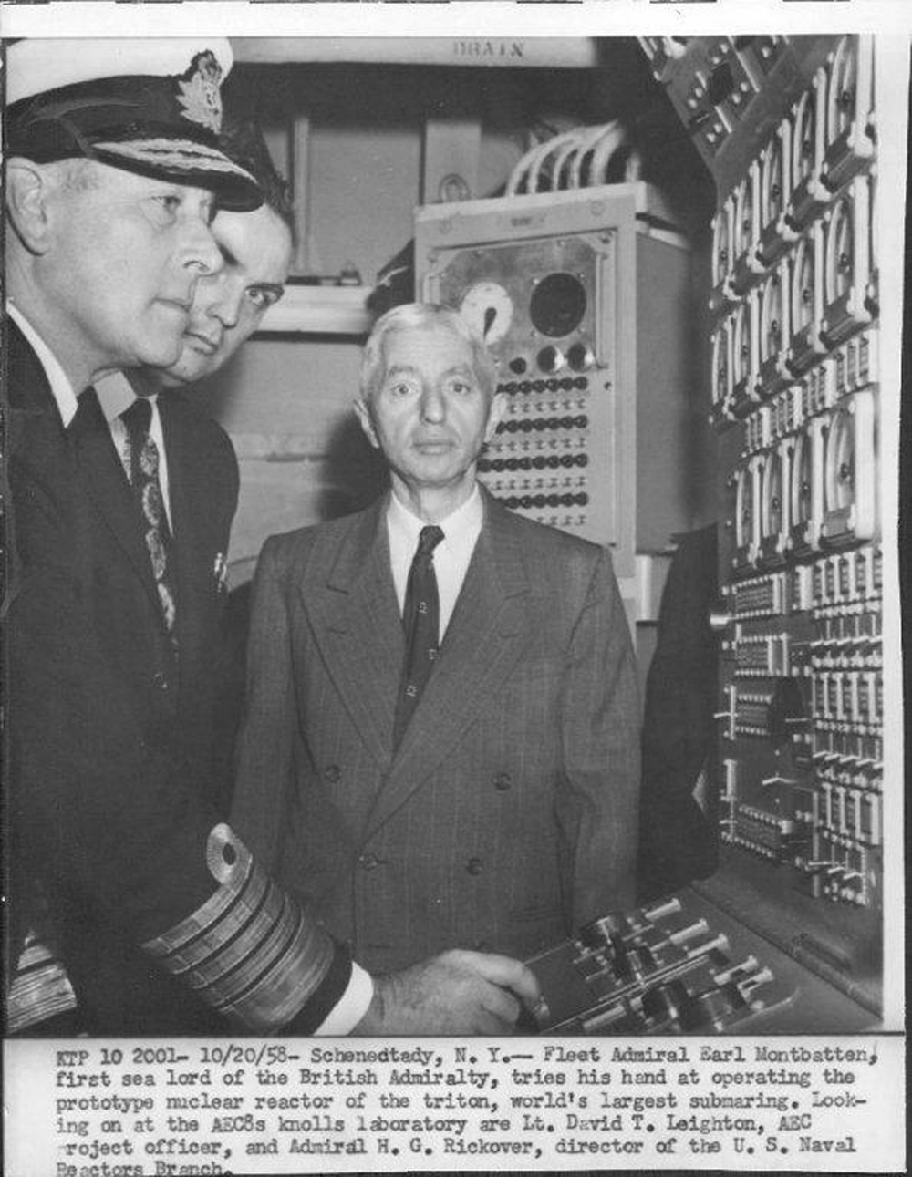 ![]() | 497k | 20 October 1958: Fleet Admiral Earl Mountbatten, First Sea Lord of the British Admirality, tries his hand at operating the prototype nuclear reactor of the Triton (SSRN-586), world's largest submarine. Looking on at the AEC Knools laboratory are Lt. Leighton, AEC Project officer & Admiral Hyman G. Rickover, director of the US Naval Reactors Branch. | A.P. Wirephoto courtesy of Tommy Trampp. | |