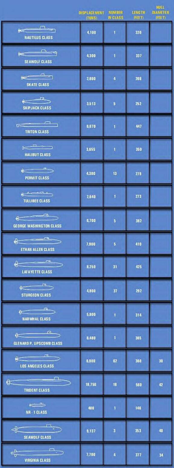 ![]() | 171k | Nuclear submarine lineup depicting the current 19 different types. | USN photo courtesy of Scott Koen & ussnewyork.com. | |