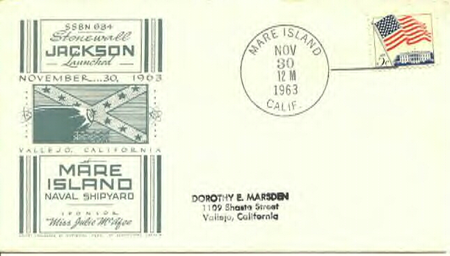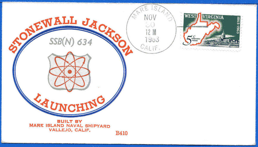 ![]() | 92k | Commemorative post mark honoring the Stonewall Jackson's (SSBN-634) launch, 30 November 1963, Mare Island Naval Shipyard, Vallejo, CA. | Courtesy of Jack Treutle (of blessed memory). Insert courtesy of Scott Koen & ussnewyork.com |