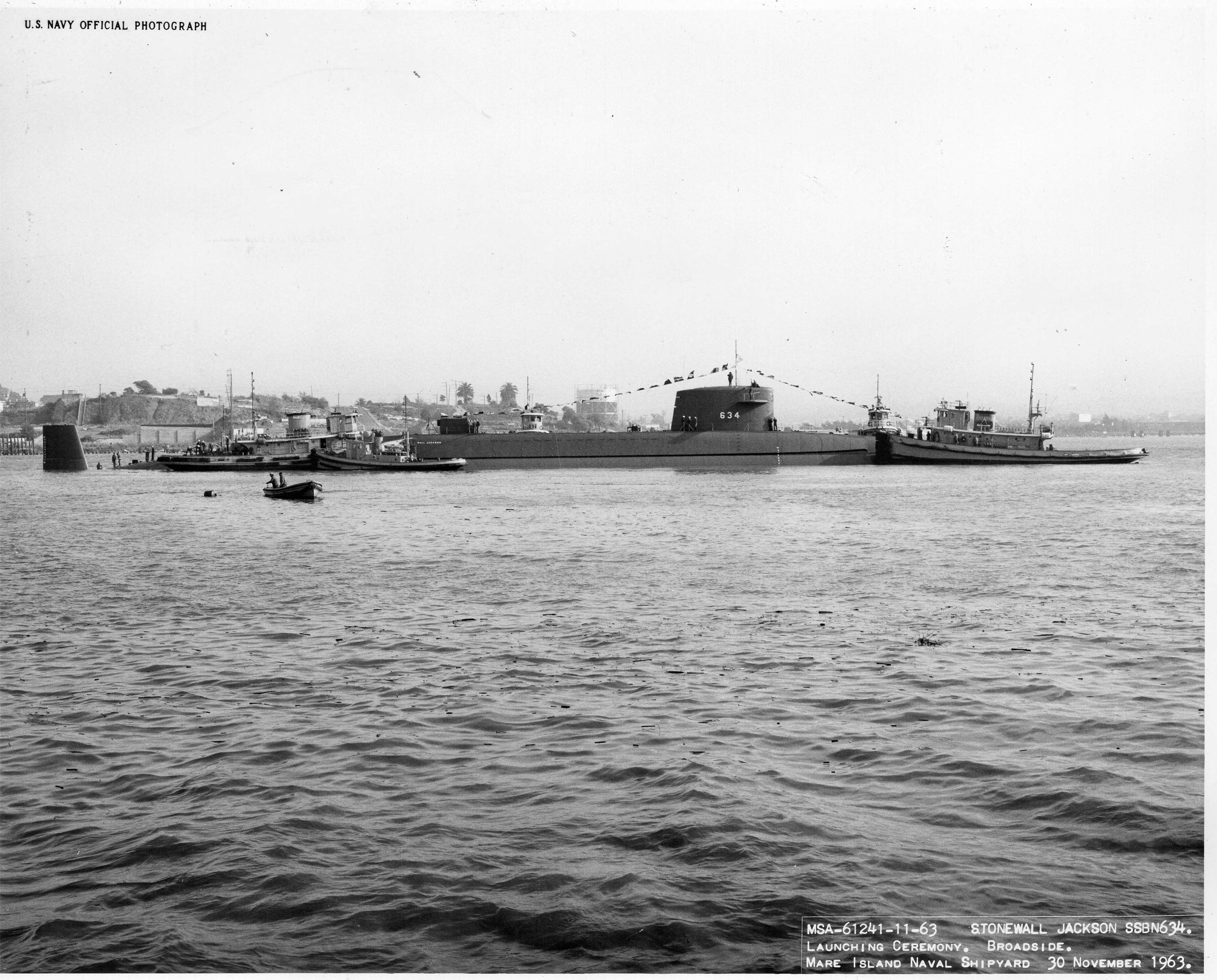 ![]() | 729k | Stonewall Jackson (SSBN-634) in the middle of Mare Island channel after her launching at Mare Island on 30 November 1963. | USN photo # 61241-11-63 VM, courtesy of Darryl L. Baker. | |
