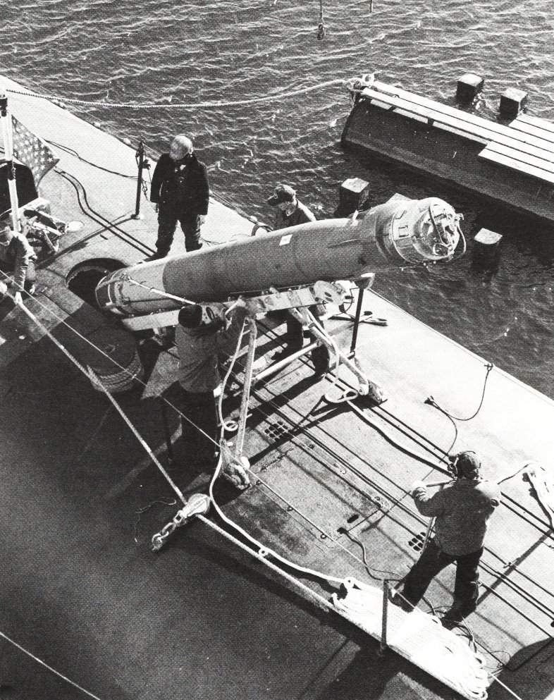 ![]() | 146k | An Mk 37 wire guided torpedo which was part of the usual armament during the 60's/70's is loaded through the torpedo launching trunk of the Stonewall Jackson (SSBN-634). | Photo i.d. & text courtesy of Michael E. Grey, TM2 Woodrow Wilson SSBN 624(G),1968-1971. US Navy / NARA photo. | |