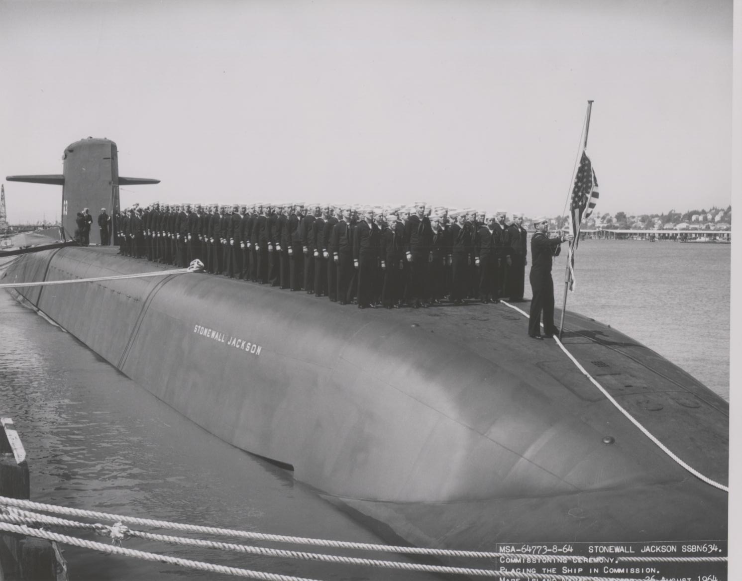 ![]() | 121k | Crew topside during commissioning ceremony of Stonewall Jackson (SSBN-634) at Mare Island Naval Shipyard on 26 August 1964. | USN photo # 64773 courtesy of Darryl L. Baker. | |