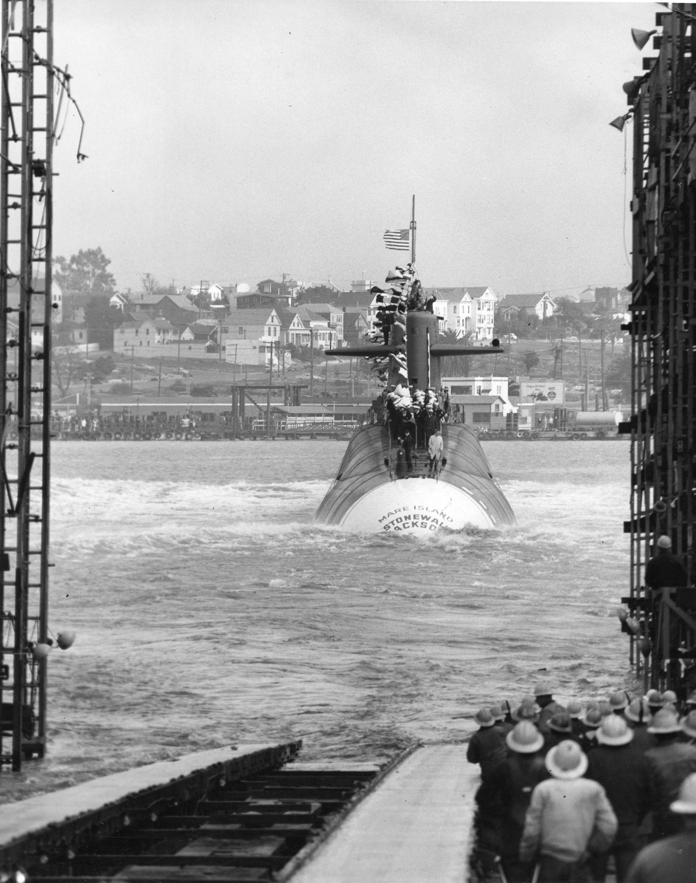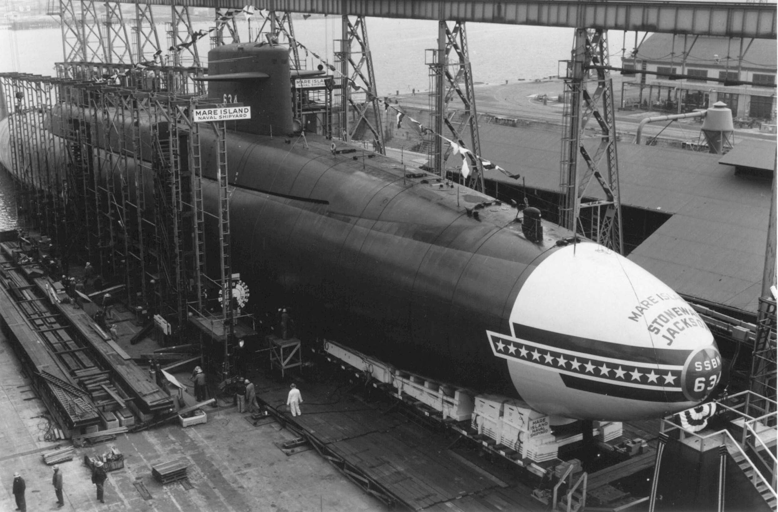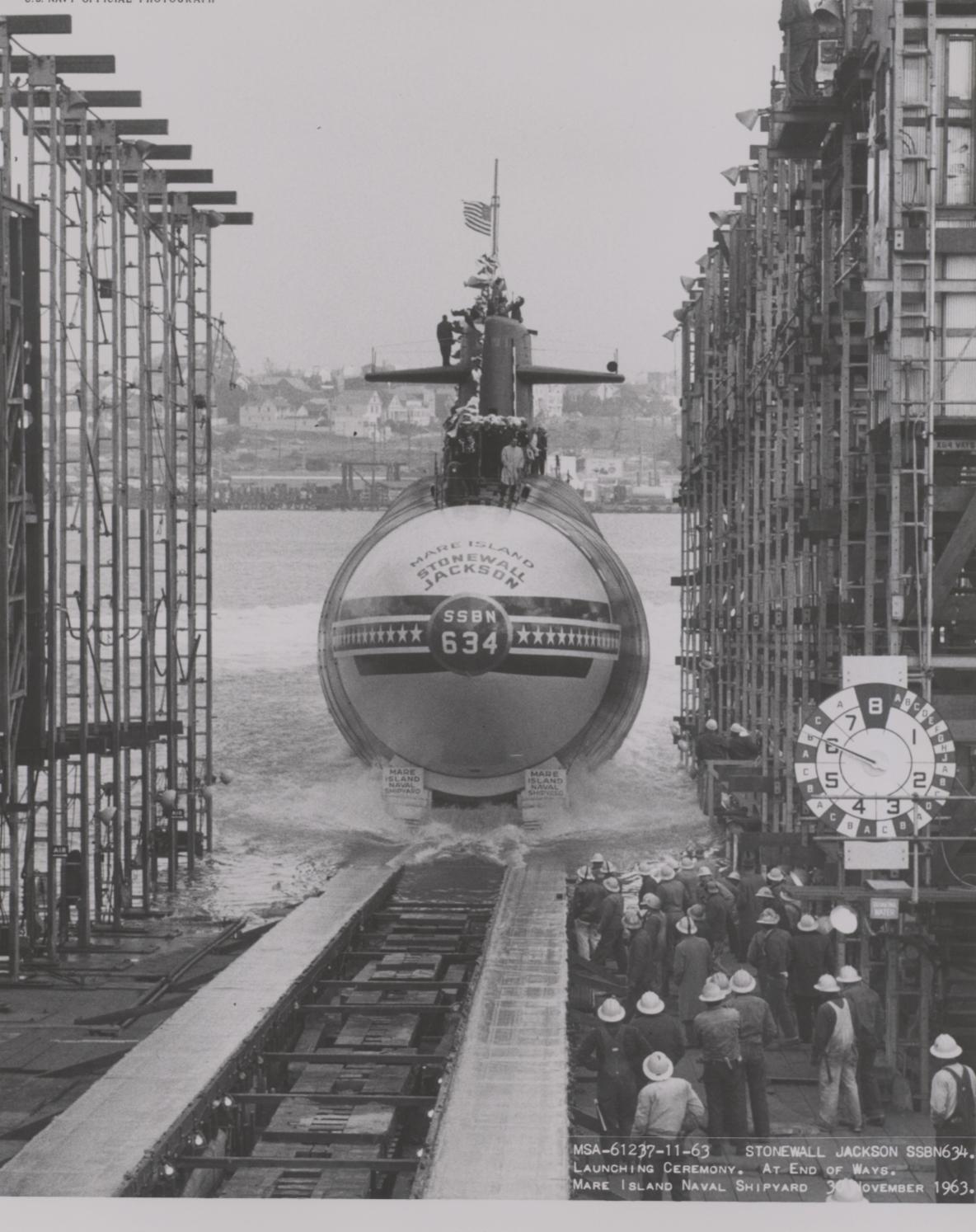 ![]() | 854k | Stonewall Jackson (SSBN-634) entering dry dock at Mare Island after her launching on 30 November 1963. | Vallejo Naval and Historical Museum photo # 61275-11-63 TH courtesy of Darryl L. Baker. | |