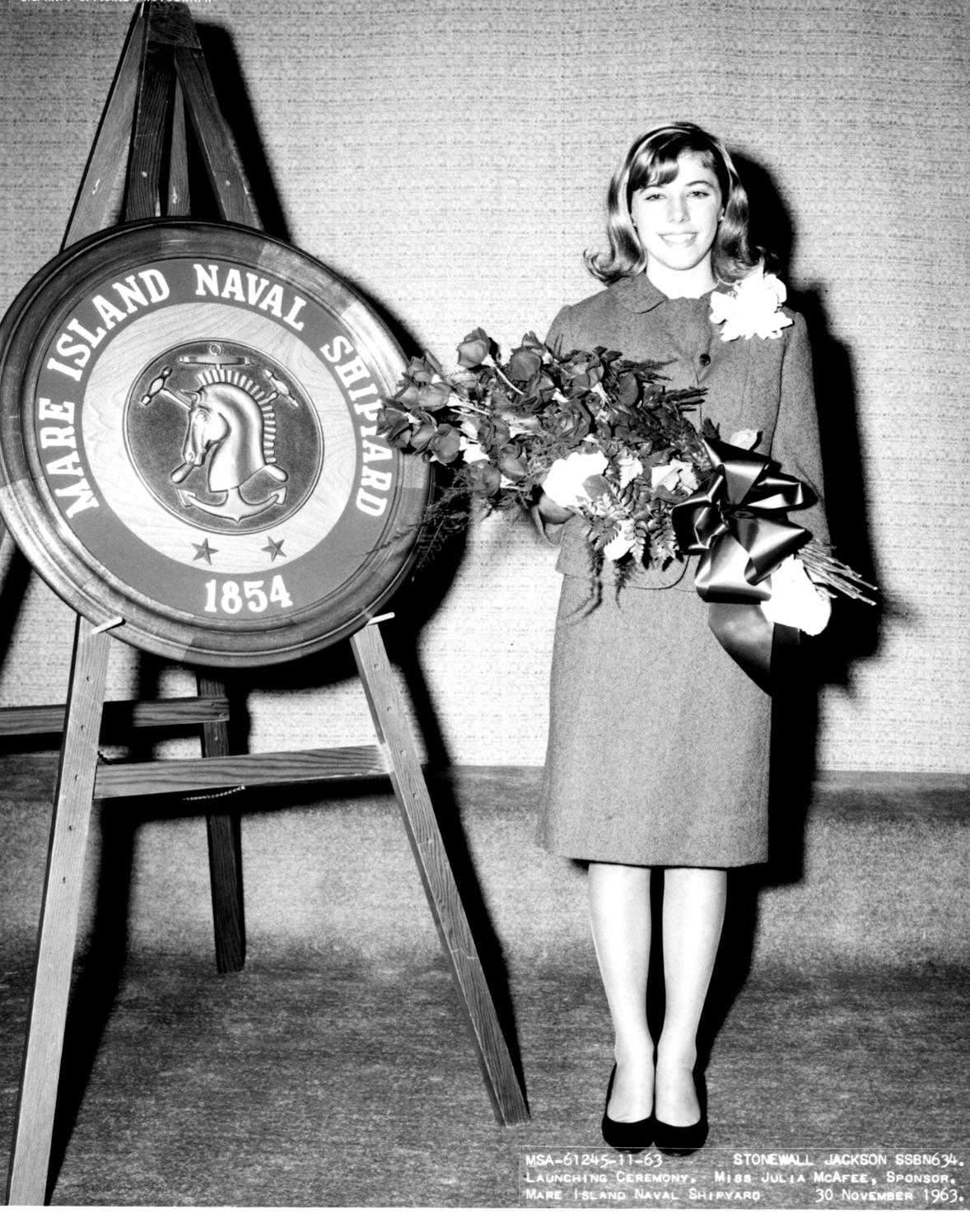![]() | 294k | Miss Julia McAfee , great granddaughter of General Stonewall Jackson and the Sponsor of the launching of the Stonewall Jackson (SSBN-634). Photo dated 30 November 1963. | USN photo # 61245 courtesy of Darryl L. Baker. | |