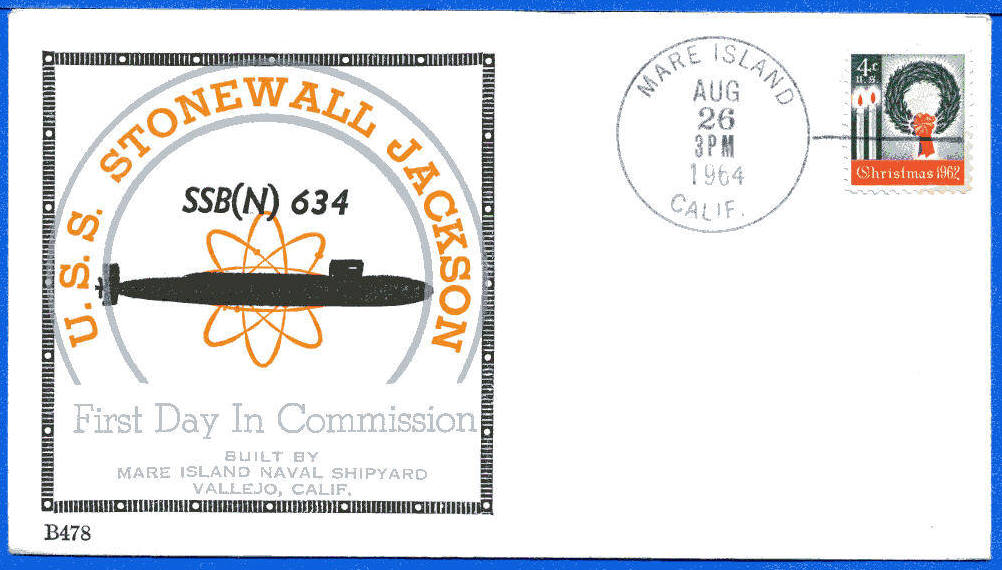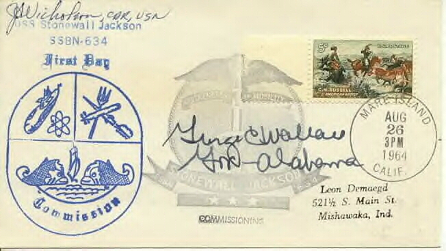 ![]() | 90k | Commemorative post mark honoring the Stonewall Jackson's (SSBN-634) commissioning, 26 August 1964. | Courtesy of Jack Treutle (of blessed memory). Insert courtesy of Scott Koen & ussnewyork.com |