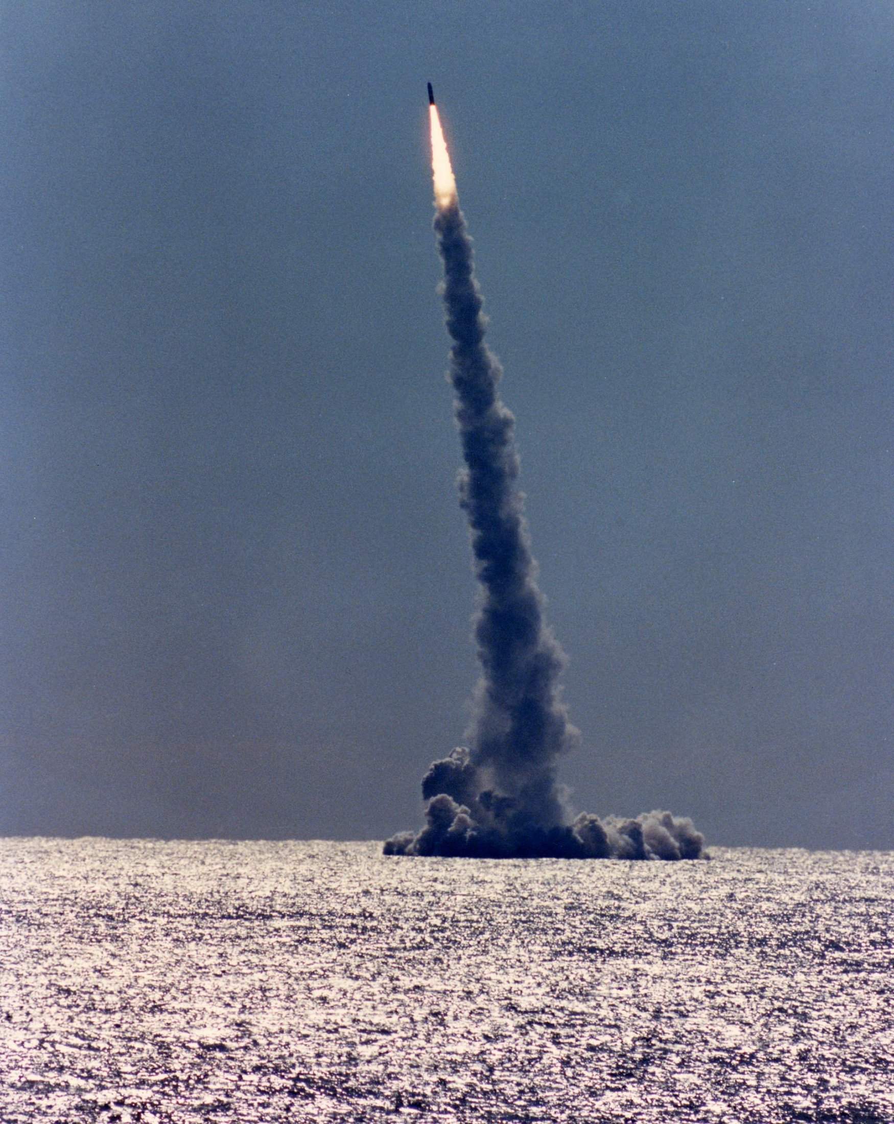 ![]() | 744k | "Reach for the sky", a Trident C4 missile that was fired from the Stonewall Jackson (SSBN-634), climbs towards the heavens on 27 February 1988. | USN photo taken from Range Sentinel by Lt. David Weaver, courtesy of Lanny W. Cusimano. | |
