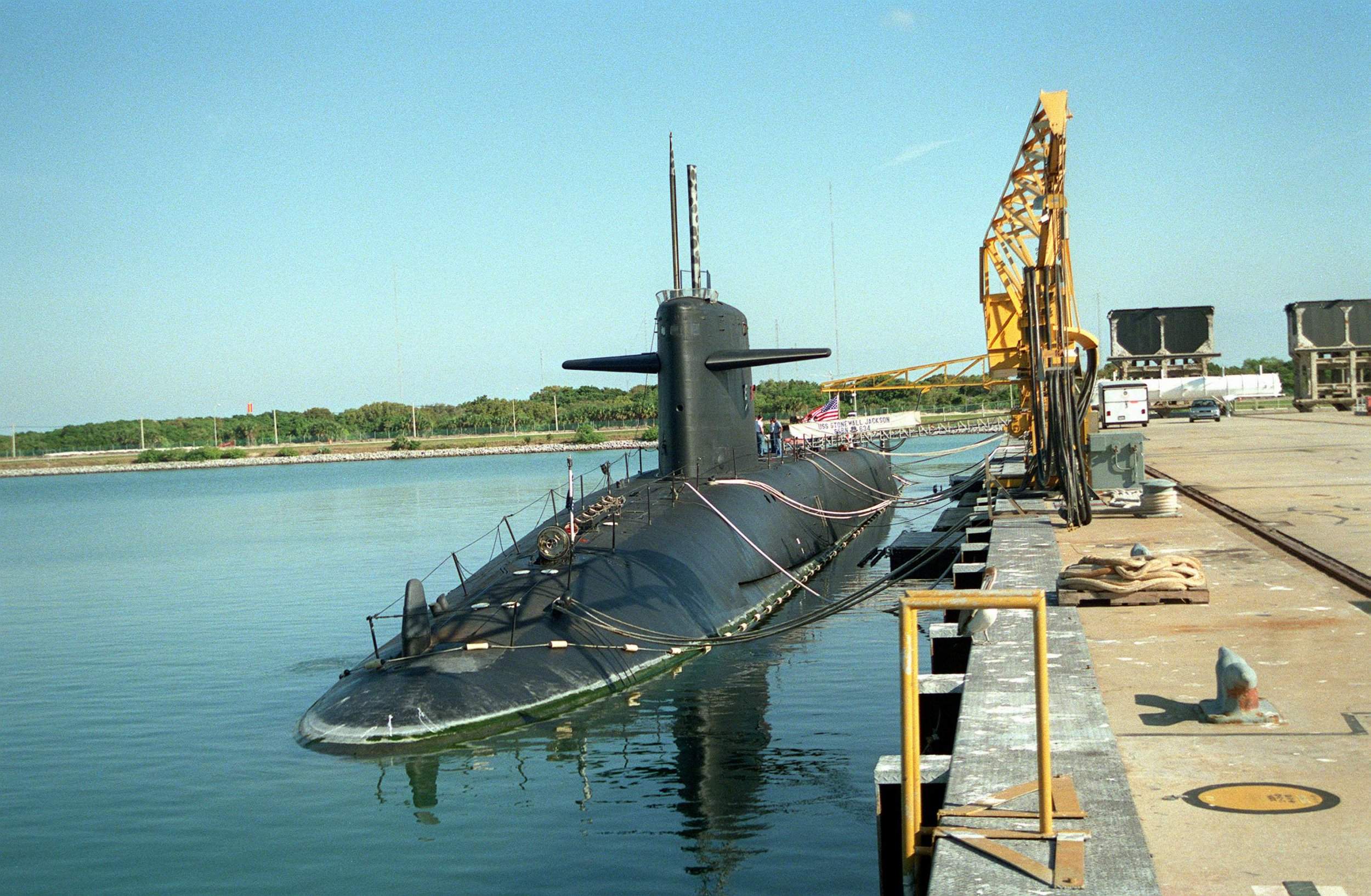 ![]() | 441k | A view of the nuclear-powered ballistic missile submarine Stonewall Jackson (SSBN-634), (left), and the nuclear-powered attack submarine Augusta (SSN-710) tied up at the Trident pier at Port Canaveral, Florida, on 13 March 1994. | Official USN photo # DN-SC-95-00045 by OS2 John Bouvia, from the Department of Defense Still Media Collection, courtesy of dodmedia.osd.mil. | |