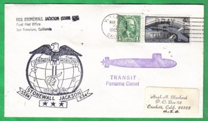 ![]() | 26k | Commemorative post mark issued on the occasion of Stonewall Jackson's (SSBN-634) transiting of the Panama Canal in March 1965. | Courtesy of Jack Treutle (of blessed memory). | |