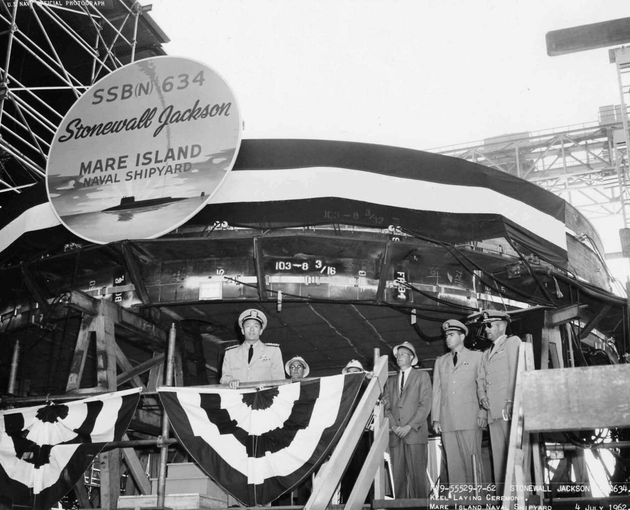 ![]() | 127k | Keel laying ceremony for Stonewall Jackson (SSBN-634) at Mare Island on 4 July 1962. From left to right: RADM Edward J. Fahy (shipyard commander) is on the speakers stand, the following are not completely visible; D. L. Hughes, E. S. Tilley, and P. F. Minasian, E. S. Harvego (mid photo), LT R. M. Flaherty (ship superintendent) and CDR Charles A. Swift, Jr. (CHC). | USN photo # 55529-7-62, courtesy of Darryl L. Baker. | |
