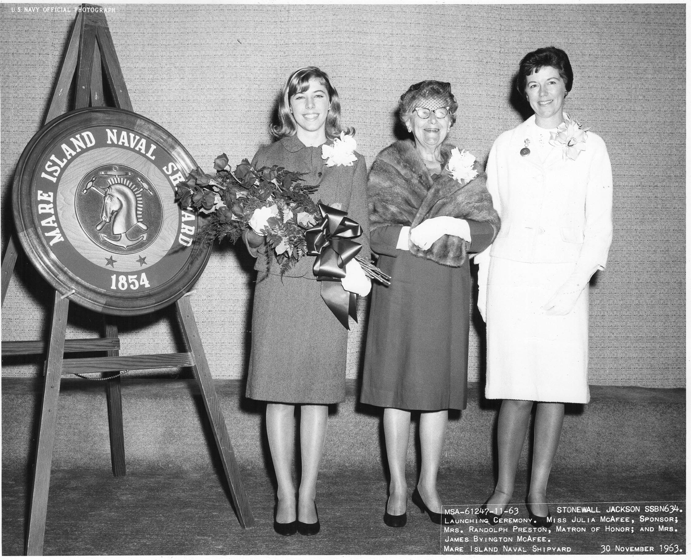 ![]() | 615k | Miss Julia McAfee (Sponsor), Mrs. Randolph Preston (Matron of Honor) and Mrs. James Byington McAfee at the reception following the launching of the Stonewall Jackson (SSBN-634). | USN photo # 61247-11-63, courtesy of Darryl L. Baker. | |