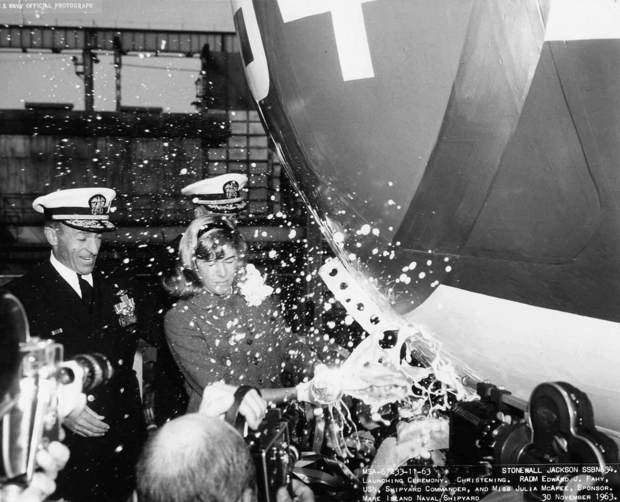 ![]() | 133k | Miss Julia McAfee , ship Sponsor, christens the Stonewall Jackson (SSBN-634) at Mare Island on 30 November 1963. RADM Edward J. Fahy, shipyard commander, is to the left of Miss McAfee . | USN photo # 61233-11-63, courtesy of Darryl L. Baker. | |