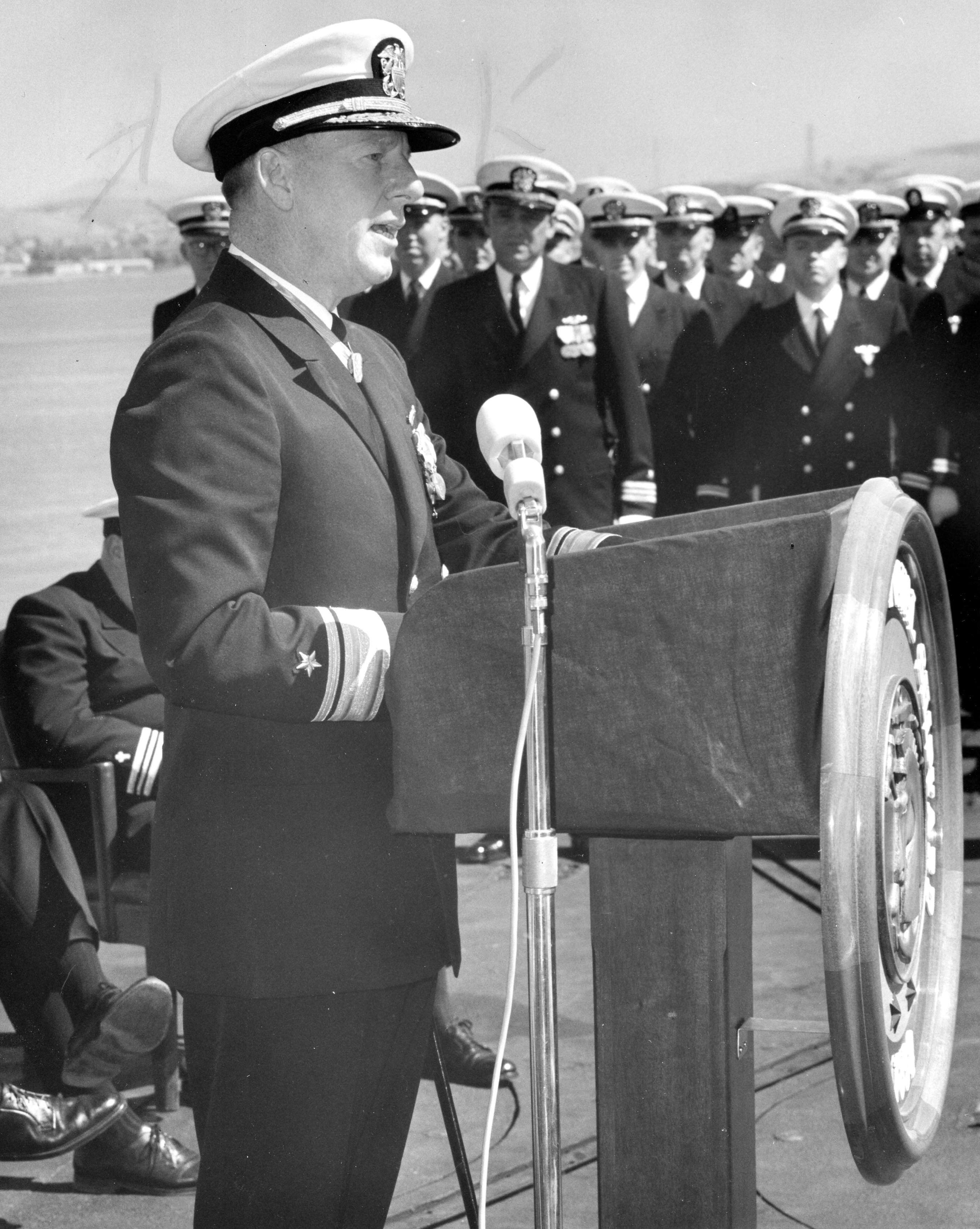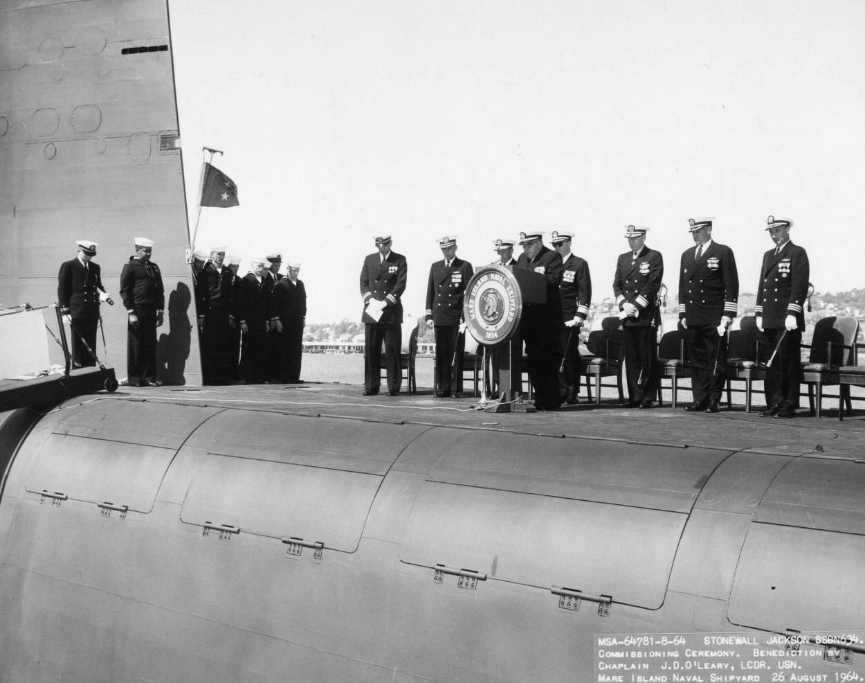 ![]() | 781k | RADM Eugene B. Fluckey (COMSUBPAC) speaks at the commissioning of the Stonewall Jackson (SSBN-634) at Mare Island on 26 August 1964. | USN photo # 64779-8-64, from the Vallejo Naval and Historical Museum courtesy of Darryl L. Baker. | |