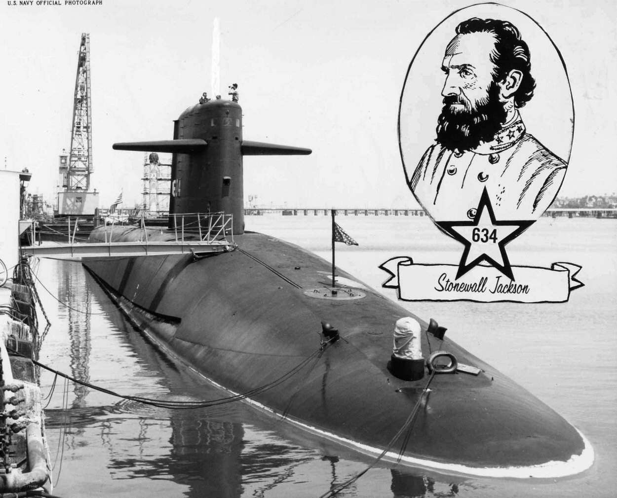 ![]() | 615k | Bow view of Stonewall Jackson (SSBN-634) with crew assembled on the deck and crowd is gathering on 30 November 1963 at Mare Island Naval Shipyard. | USN photo # 61224-11-63, courtesy of Darryl L. Baker. | |