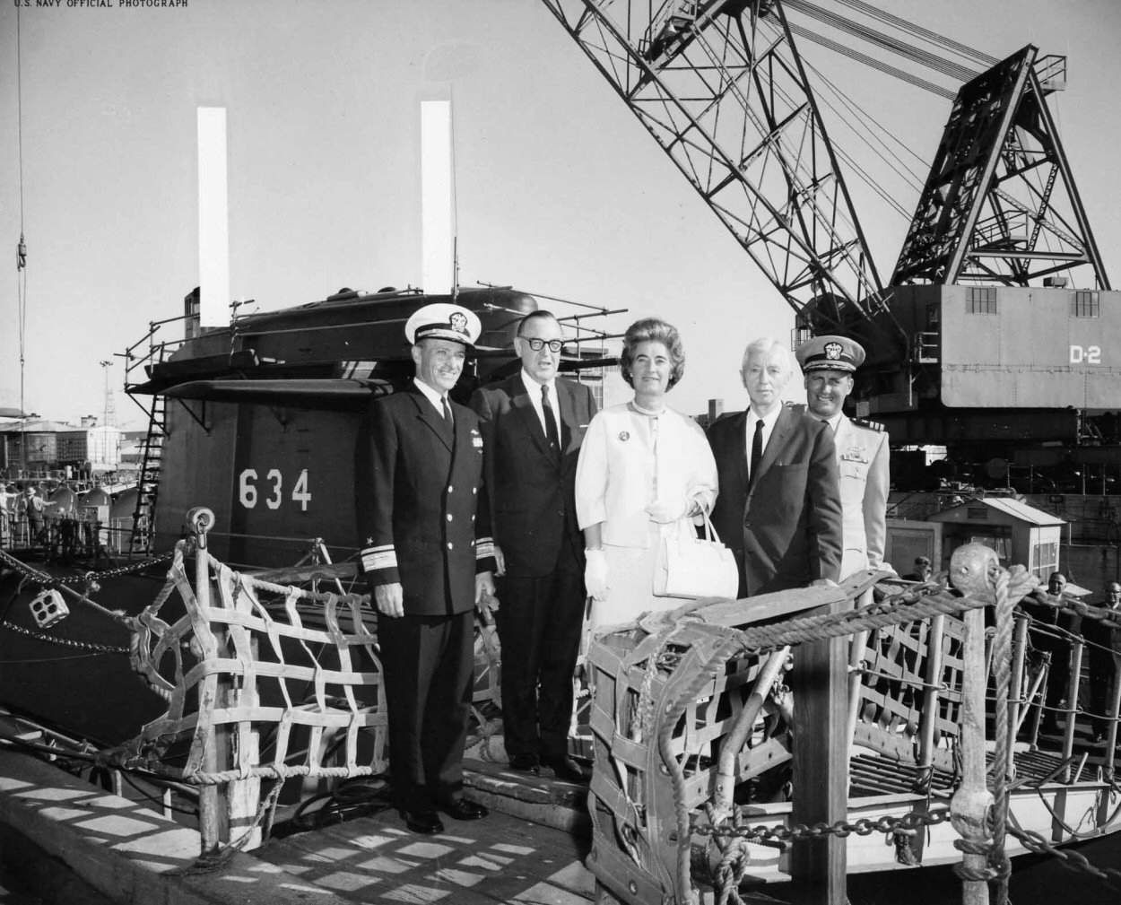 ![]() | 143k | Official visitors boarding the Stonewall Jackson (SSBN-634) at Mare Island in July 1964 while she was in the yard's dry dock #3. From left to right RADM Edward J. Fahy, shipyard commander, Governor Brown of California, Mrs. Fahy, VADM Hyman G. Rickover and CDR John H. Nicholson (PCO). The mast has been censored out of the photo. | USN photo # 64119-64, courtesy of Darryl L. Baker. | |
