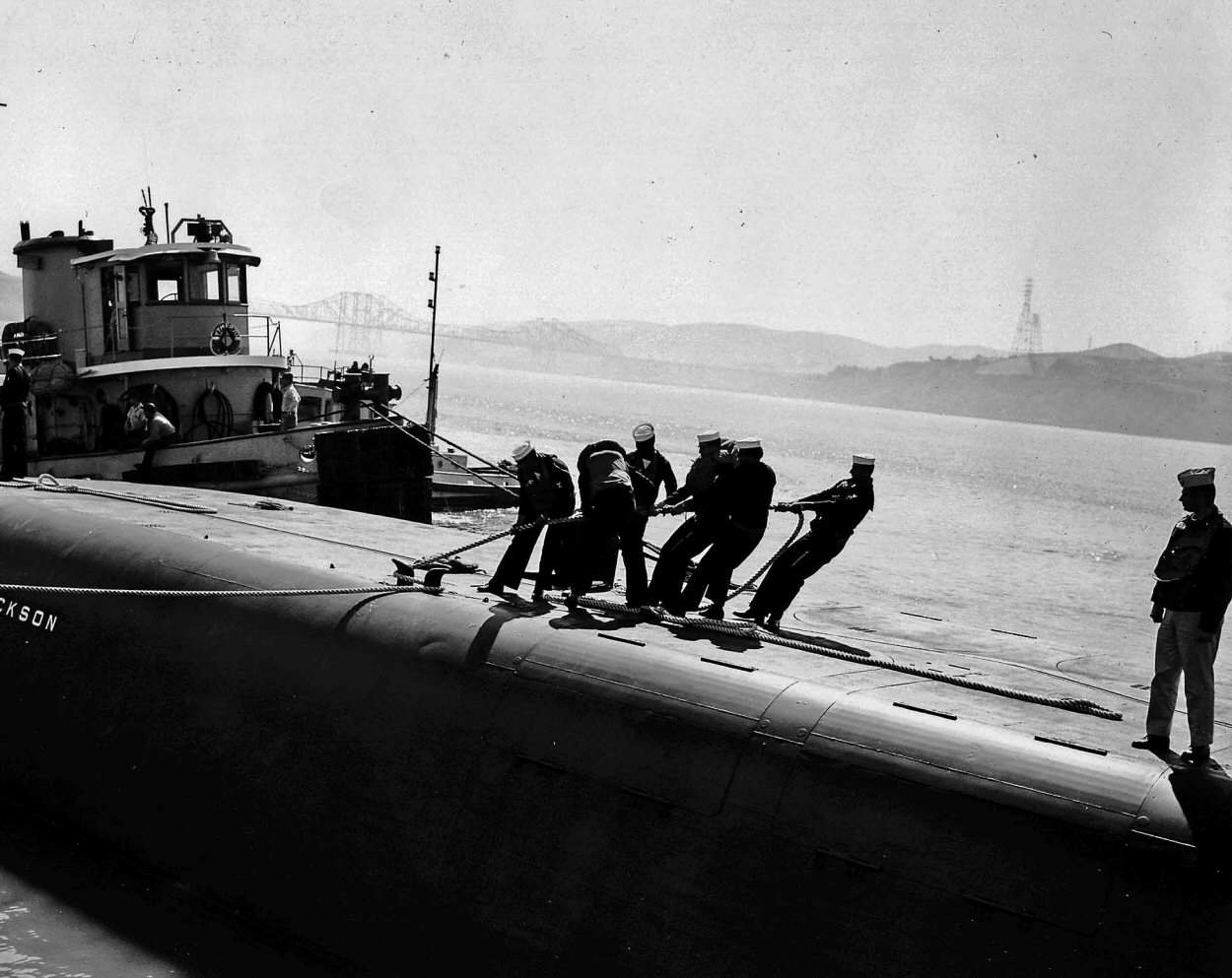 ![]() | 104k | Line handlers aboard Stonewall Jackson (SSBN-634) at the South end of Mare Island in September 1964. | USN photo # 64891-9-64, courtesy of Darryl L. Baker. | |