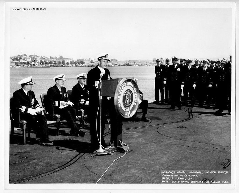 ![]() | 425k | RADM Fahy speaks at the commissioning of the Stonewall Jackson (SSBN-634) at Mare Island on 26 August 1964. | USN photo courtesy of Ron Reeves (of blessed memory). | |