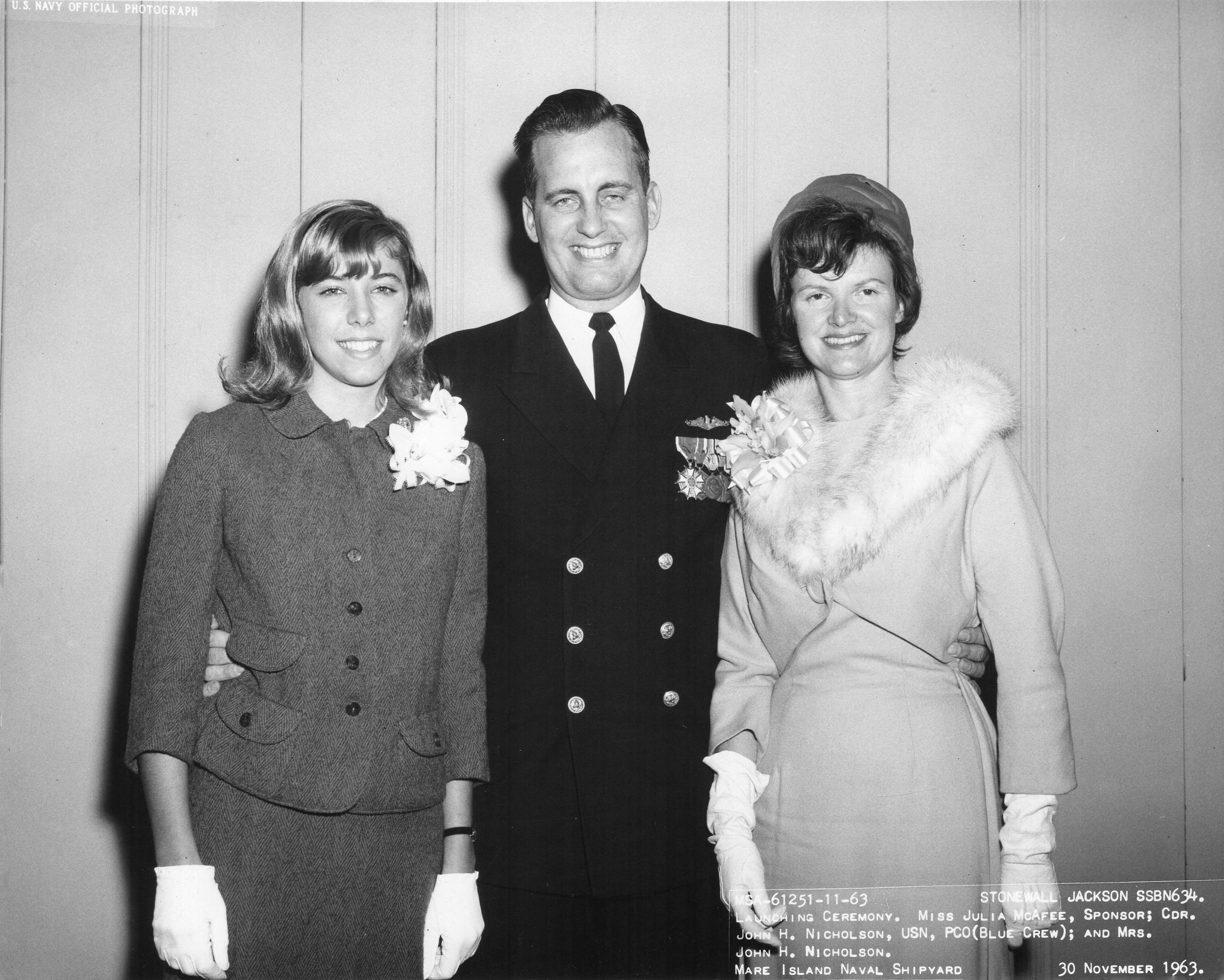 ![]() | 709k | Photo of Blue Crew PCO, his wife and ship's Sponsor. VIPs at launching reception for the Stonewall Jackson (SSBN-634) at Mare Island on 30 November 1963. Left to right: Miss Julia McAfee (Sponsor), CDR John H. Nicholson (PCO, Blue Crew) and Mrs. Nicholson. | Photo # SSBN 634 61251-11-63 from the files of the Vallejo Naval & Historical Museum via Darryl L. Baker. | |