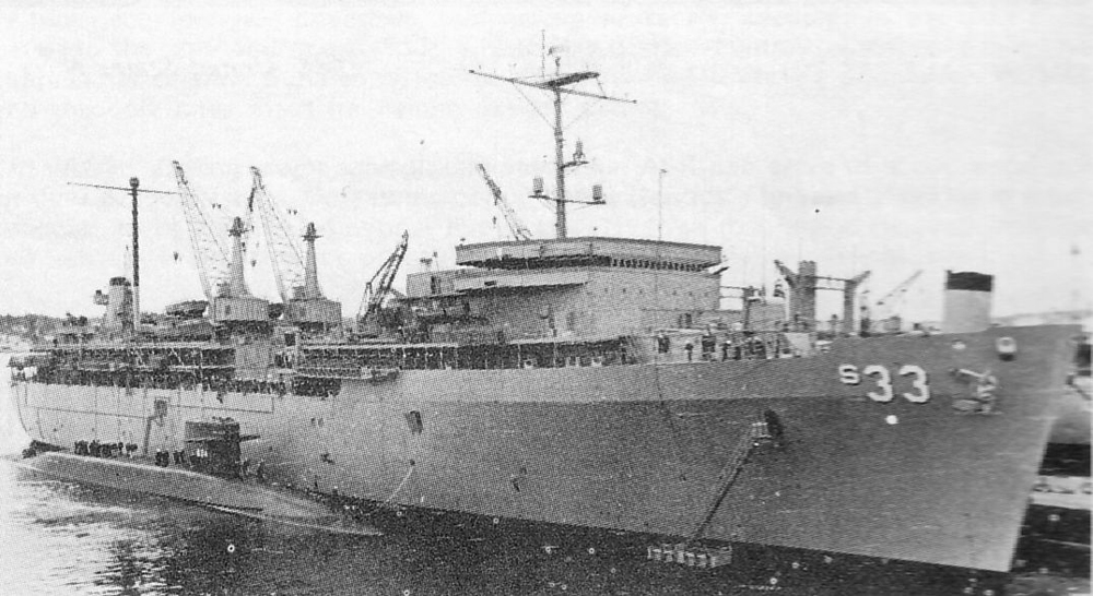 ![]() | 303k | Simon Lake (AS-33) servicing the Stonewall Jackson (SSBN-634) in 1965. | Photo courtesy of Robert Hurst. | |