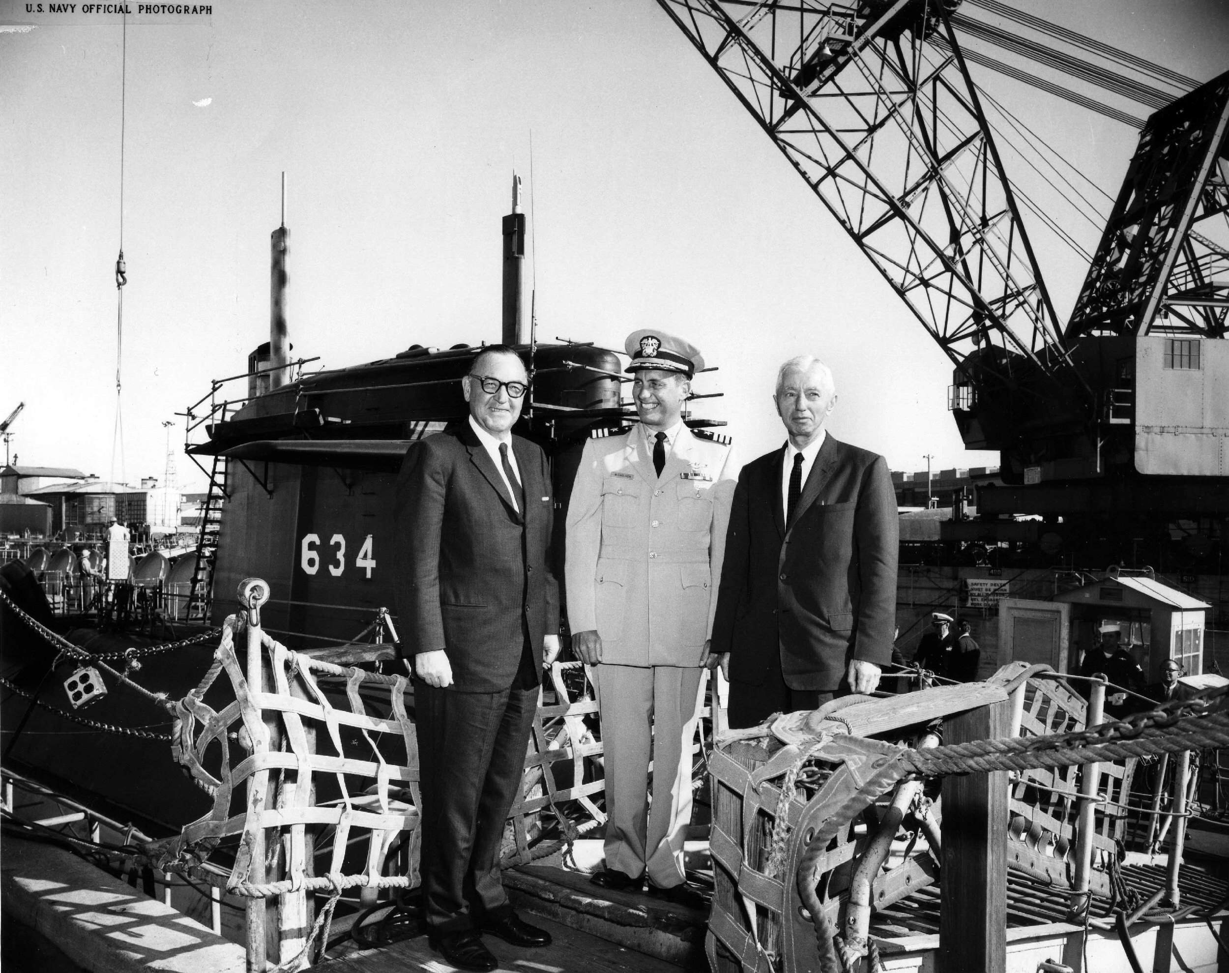 ![]() | 514k | California Governor Edmund G. Brown; CDR J. H. Nicholson, Commanding Officer (Blue Crew); and VADM Hyman G. Rickover are about to go aboard the Stonewall Jackson (SSBN-634) in dry dock #2 at Mare Island on 7 July 1964. | USN photo # 64118-7-64, courtesy of Darryl L. Baker. | |