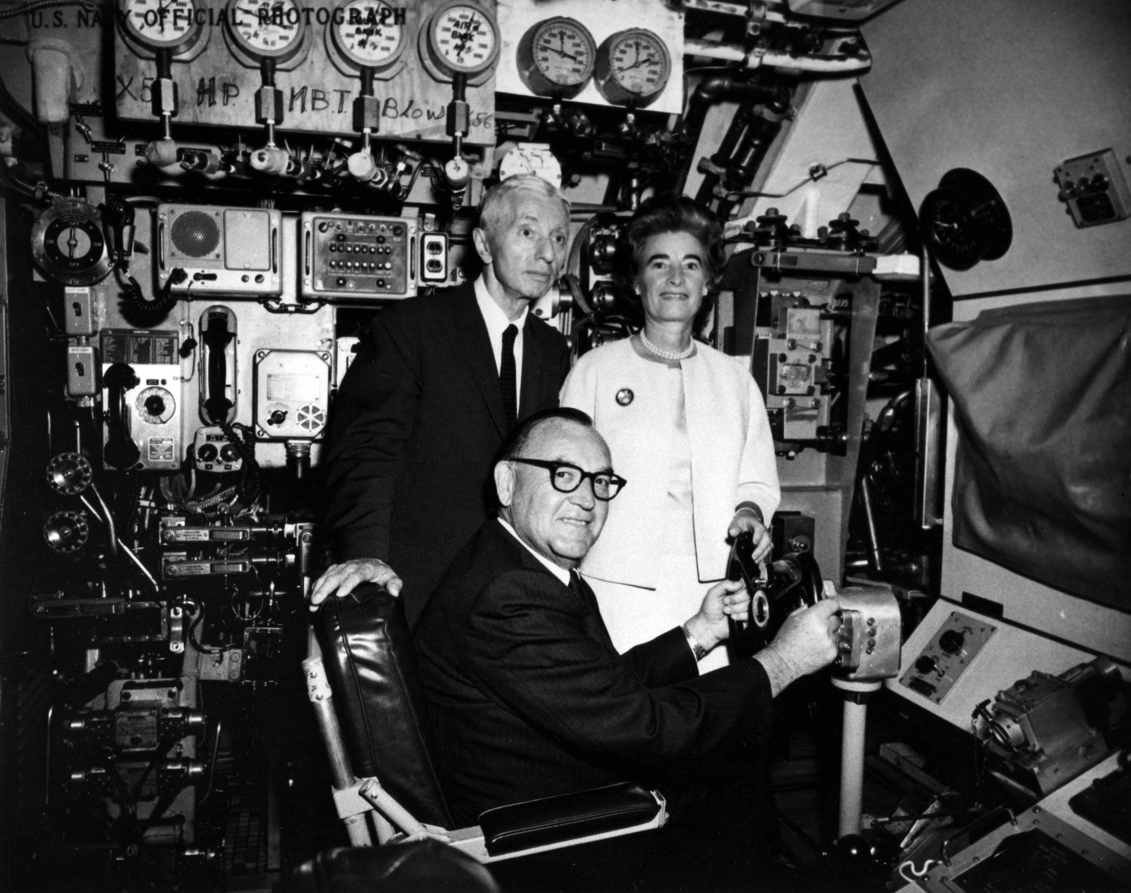 ![]() | 729k | California Governor Edmund G. Brown; Mrs. Edmund G. Brown, and VADM Hyman G. Rickover in the control room of the Stonewall Jackson (SSBN-634) in dry dock #2 at Mare Island on 7 July 1964. | USN photo # 64123-7-64, courtesy of Darryl L. Baker. | |