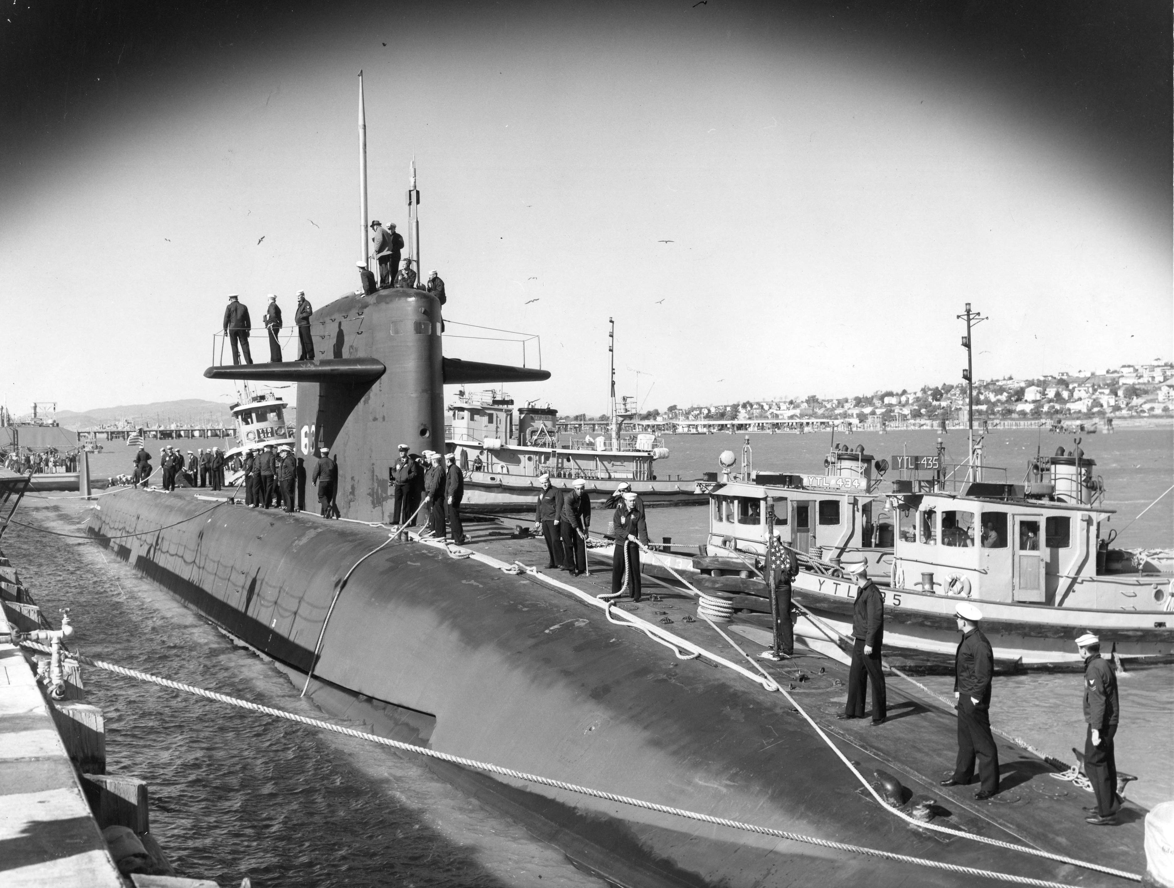 ![]() | 876k | Stonewall Jackson (SSBN-634) returns to Mare Island on 10 February 1965 after a shakedown cruise and missile test-firing. Tug ID from left to right: Lelaka (YTB-514), Orono (YTB-190), YTL-434 and YTL-435. | Vallejo Naval and Historical Museum photo # 66640-2-65 TH courtesy of Darryl L. Baker. | |