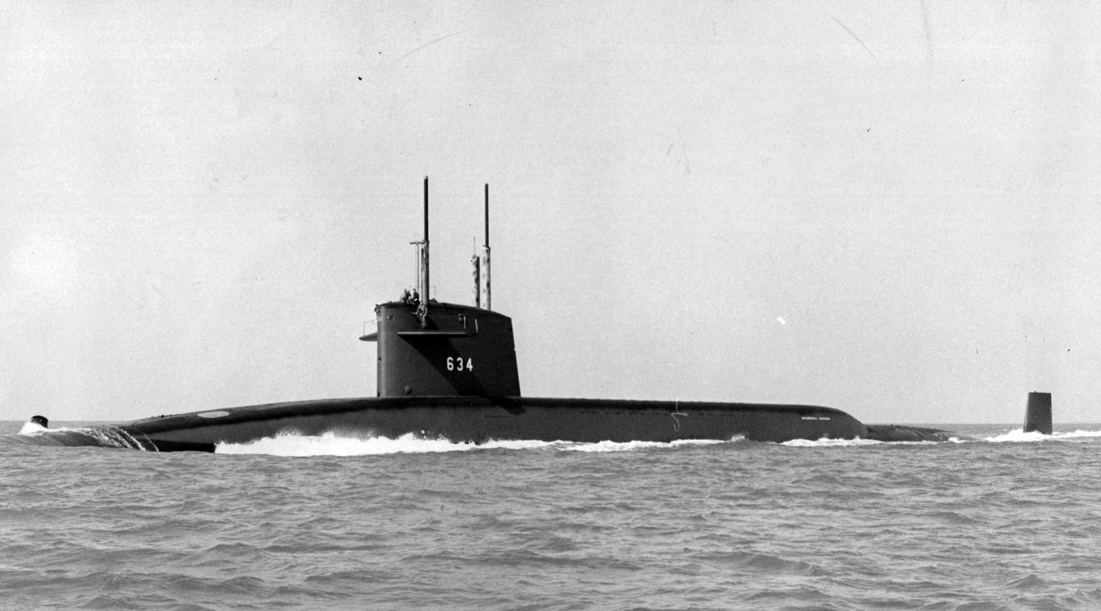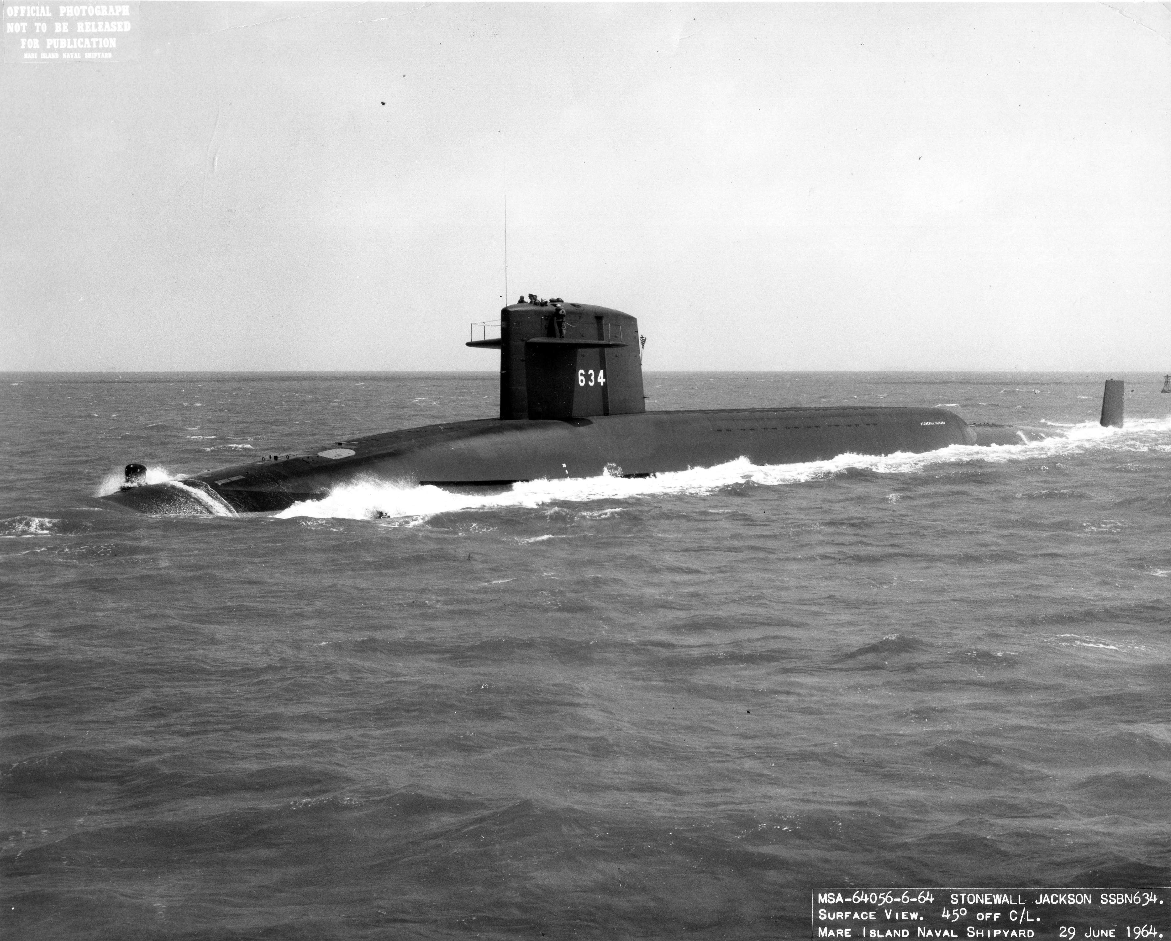 ![]() | 589k | Stonewall Jackson (SSBN-634) on builders trials in late June 1964. | Vallejo Naval and Historical Museum photo # 64055-6-64 TH courtesy of Darryl L. Baker. | |