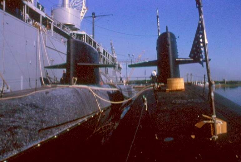 ![]() | 44k | A pair of boomers tied up to a pier in Charleston, S.C., 1982. George Bancroft (SSBN-643) is inboard of the Stonewall Jackson (SSBN-634). | USN photo courtesy of Phil L. Rasey. | |