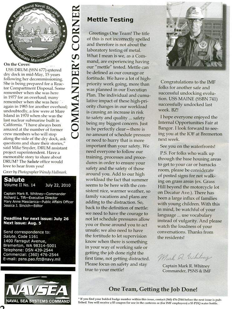 ![]() | 338k | Dated 20 August 1968, keel cover letter of Drum (SSN-677). The Drum was the 17th nuclear submarine built at the shipyard. | USN photo courtesy of Darryl L. Baker. | |