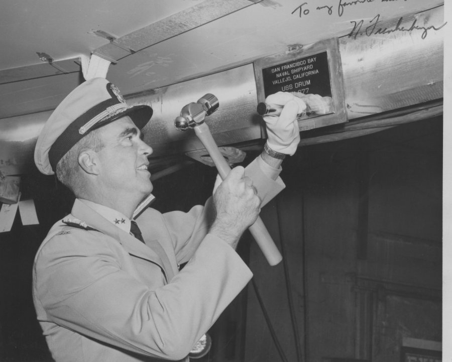 ![]() | 76k | Dated 20 August 1968. RADM Norbert Frankenberger (Shipyard Commander Mare Island) authenticating keel of Drum (SSN-677). | USN photo courtesy of Darryl L. Baker. | |