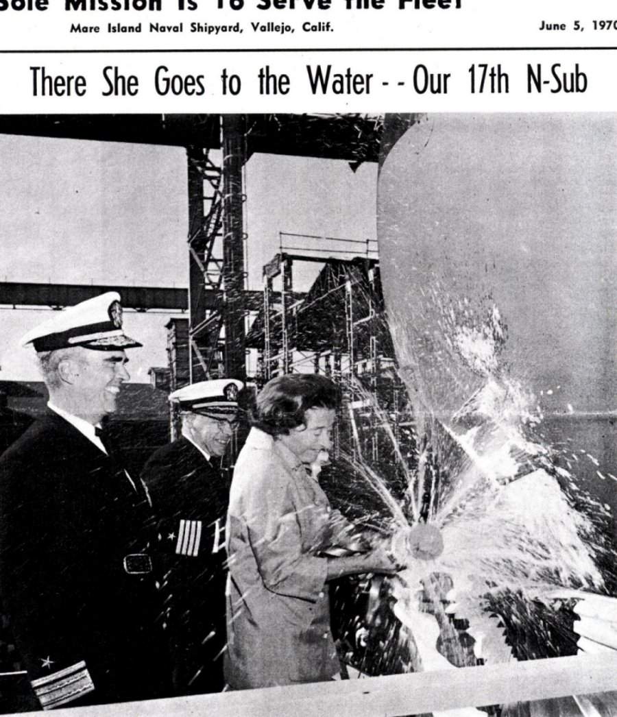 ![]() | 731k | Official launching party for the Drum (SSN-677) at Mare Island on 23 May 1970. Seated Left to right: Mrs. Joseph H. Thorton, Mrs. Harry Mason, Mrs. Daniel Z. Henkin, Mrs. Peter Horne (Matron of Honor), Mrs. William F. Bringle (Sponsor), Mrs. N. Frankenberger, Mrs. Glenn Thomson and Mrs. William Greig. Standing left to right: Capt. Thorton (Production Officer), RADM Mason (NAVSHIPS), Assistant Secretary of Defense (Public Affairs) Henkin speaker at the launching, Dan Bringle, son of VADM William F. Bringle (COMNAVAIRPAC), RADM N. Frankenberger and LCDR Thomson (Chaplain) and W. E. Greig (triggerman). | USN photo # 98306-5-70 courtesy of the Vallejo Naval and Historical Museum via Darryl L. Baker. | |