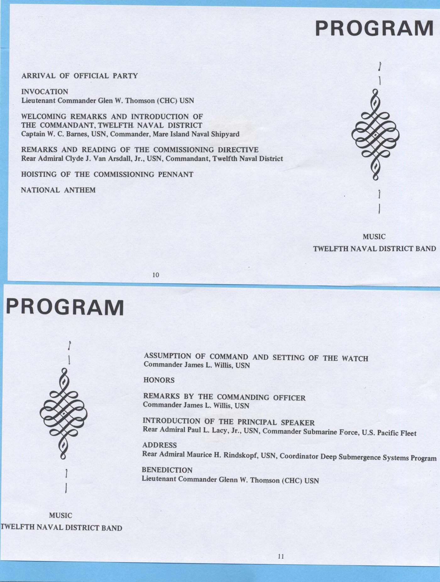 ![]() | 3.14k | The front cover of Drum (SSN-677) 13 page PDF Commissioning Program and its back showing vital statistics on the sub. | USN photo courtesy of Darryl L. Baker. | |