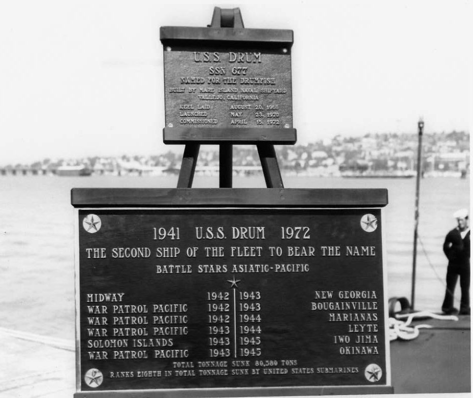 ![]() | 114k | Builder's plaque (Fleet Introduction Site) on display during the commissioning ceremonies for the Drum (SSN-677) on 15 April 1972 at Mare Island. | USN photo courtesy of Darryl L. Baker. | |