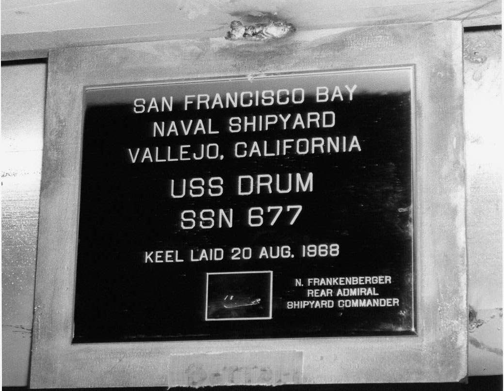 ![]() | 92k | The keel plate of the Drum (SSN-677) seen after RADM N. Frankenberger authenticated the keel on 20 August 1968 at Mare Island. Note: At this time Mare Island and Hunters Point shipyards were under a single management team called San Francisco Bay Naval Shipyard. | USN photo courtesy of Darryl L. Baker. | |
