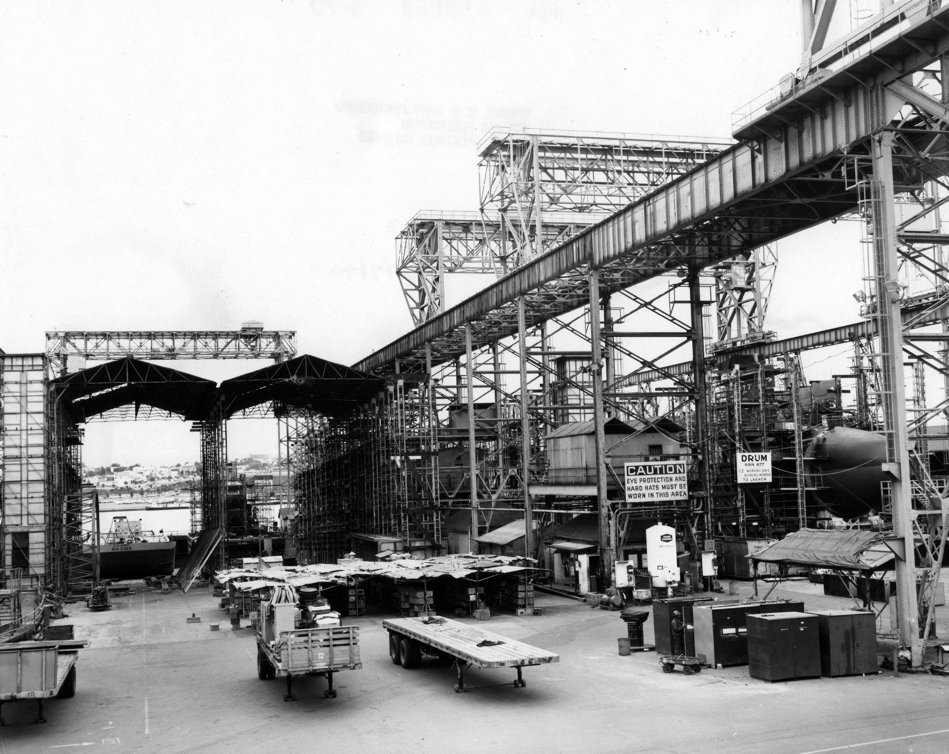 ![]() | 826k | Here is a rare photo of the Drum (SSN-677) on the building way at Mare Island on 10 May 1970. US Army Barge BG-6383 is to the far left and YC-982 is in the middle. | USN photo # MINSY 98059 courtesy of Darryl L. Baker. | |