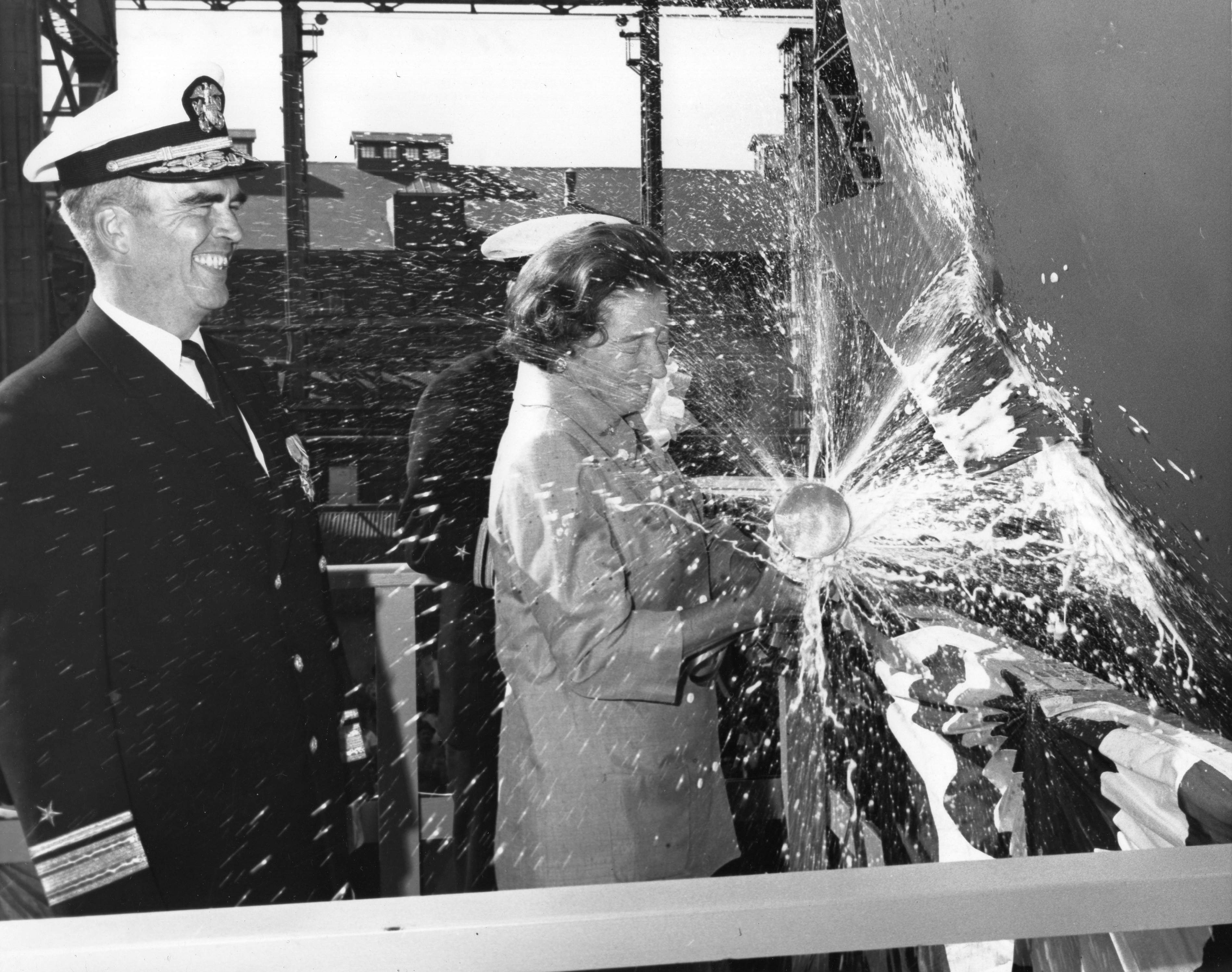 ![]() | 887k | Mrs. William F. Bringle (Sponsor) christens Drum (SSN-677) on 23 May 1970 as RADM N. Frankenberger watches. | USN photo # 98303-5-70 courtesy of the Vallejo Naval and Historical Museum via Darryl L. Baker. | |