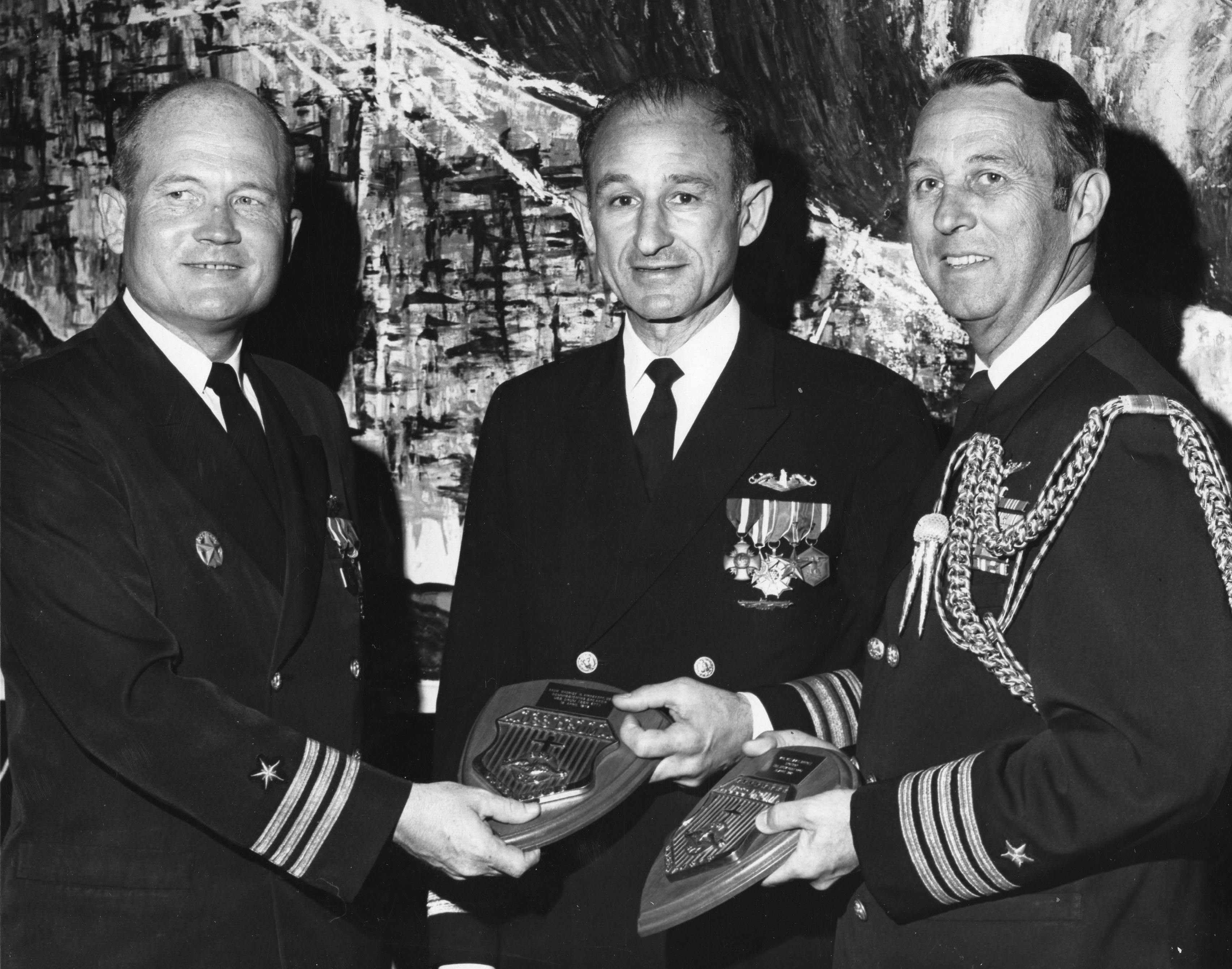 ![]() | 668k | CDR James Willis (CO, Drum (SSN-677)) presented plaques following the commissioning to RADM Maurice H. Rindskopf, commissioning speaker and former CO of Drum (SS-228), and Capt. Newton B. Foss who accepted the plaque in behalf of the ship's sponsor, Mrs. William F. Bringle. | USN photo # 110102-4-72 courtesy of the Vallejo Naval and Historical Museum via Darryl L. Baker. | |