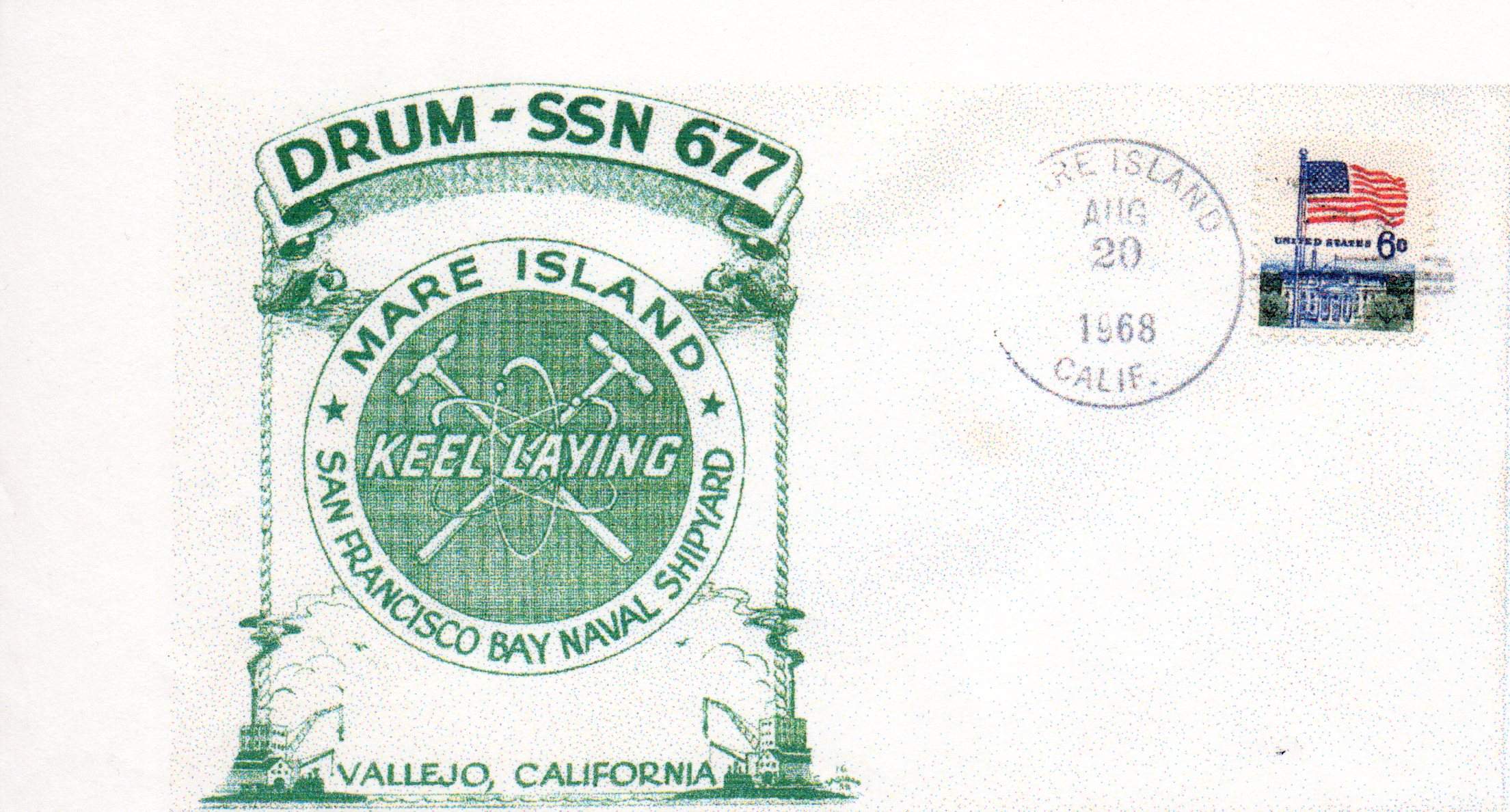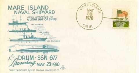 ![]() | 29k | Commemorative postal cover marking the launching of the Drum (SSN-677) 23 May 1970 and different types of ships built at the Mare Island Navy Yard, CA. | Courtesy of Jack Treutle (of blessed memory). | |