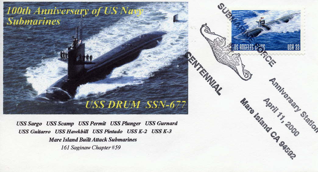 ![]() | 88k | Commemorative postal cover marking the 100 anniversary of the submarine service on 11 April 2000, picturing the Drum (SSN-677) and listing all the Mare Island Navy Yard, CA. built nuclear attack submarines. | Courtesy of The Vallejo Naval & Historical Museum and submitted by Darryl L. Baker. | |