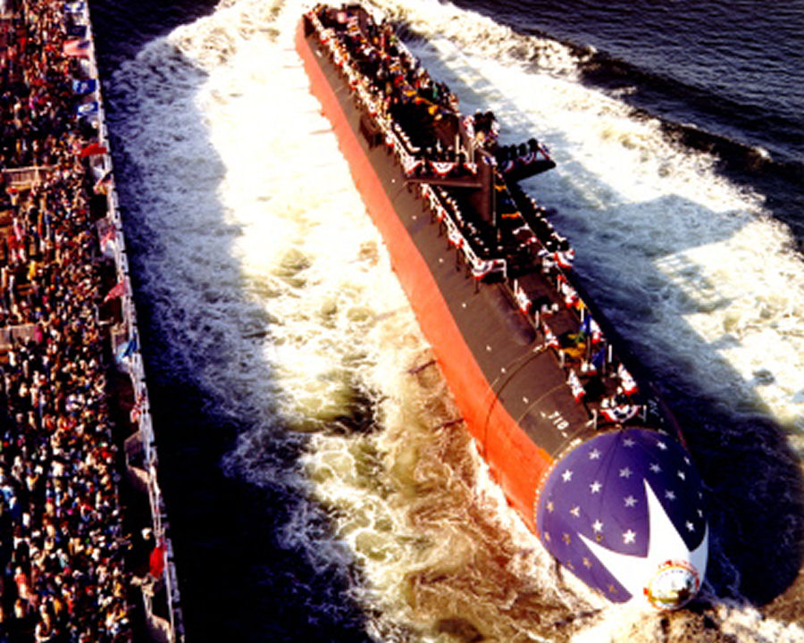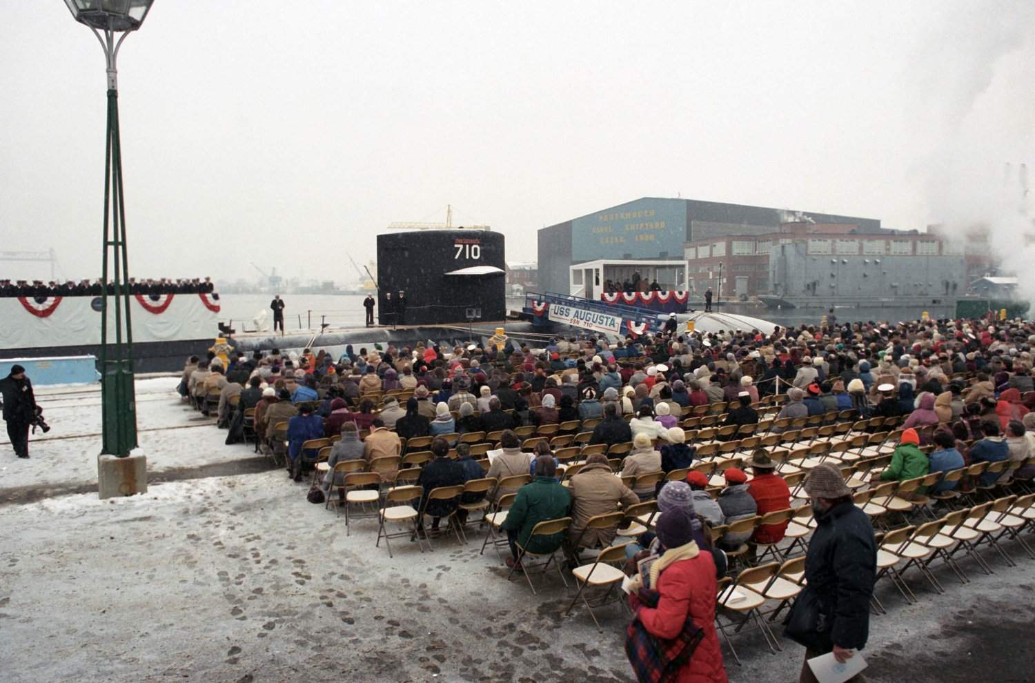 ![]() | 177k | The Augusta (SSN-710) slides down the building ways into the water at the Electric Boat Division of General Dynamics Corp., Groton, CT., 21 January 1984. | USN photo / Electric Boat. | |