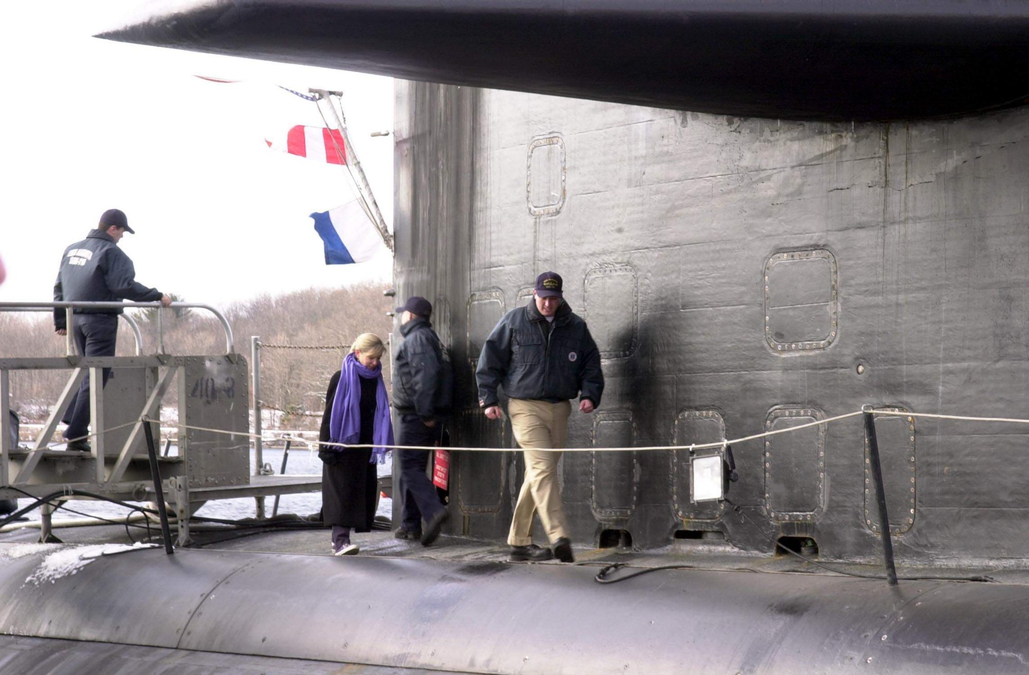 ![]() | 263k | Aboard Augusta (SSN-710) Supply Officer, Lt. j.g. Wallace Milligan, escorts Sara Moulton, host of the television program "Sara's Secrets," on a tour through the nuclear-powered, Los Angeles class attack submarine on 7 January 2003. Moulton and a camera crew visited the sub to shoot a segment about the U.S. Navy's Mess Management Specialists (MS's) or cooks. During the show's visit, MS's show how they are accustomed to cooking in small spaces and share some tips on how to spice up meals for home cooks. | USN photo # N-0000S-001 by Journalist 1st Class Mark A. Savage, courtesy of news.navy.mil. | |