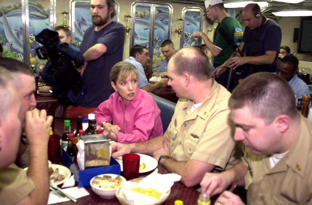 ![]() | 268k | Aboard Augusta (SSN-710) Supply Officer, Lt. j.g. Wallace Milligan, escorts Sara Moulton, host of the television program "Sara's Secrets," on a tour through the nuclear-powered, Los Angeles class attack submarine on 7 January 2003. Moulton and a camera crew visited the sub to shoot a segment about the U.S. Navy's Mess Management Specialists (MS's) or cooks. During the show's visit, MS's show how they are accustomed to cooking in small spaces and share some tips on how to spice up meals for home cooks. | USN photo # N-0000S-002 by Journalist 1st Class Mark A. Savage, courtesy of news.navy.mil. | |
