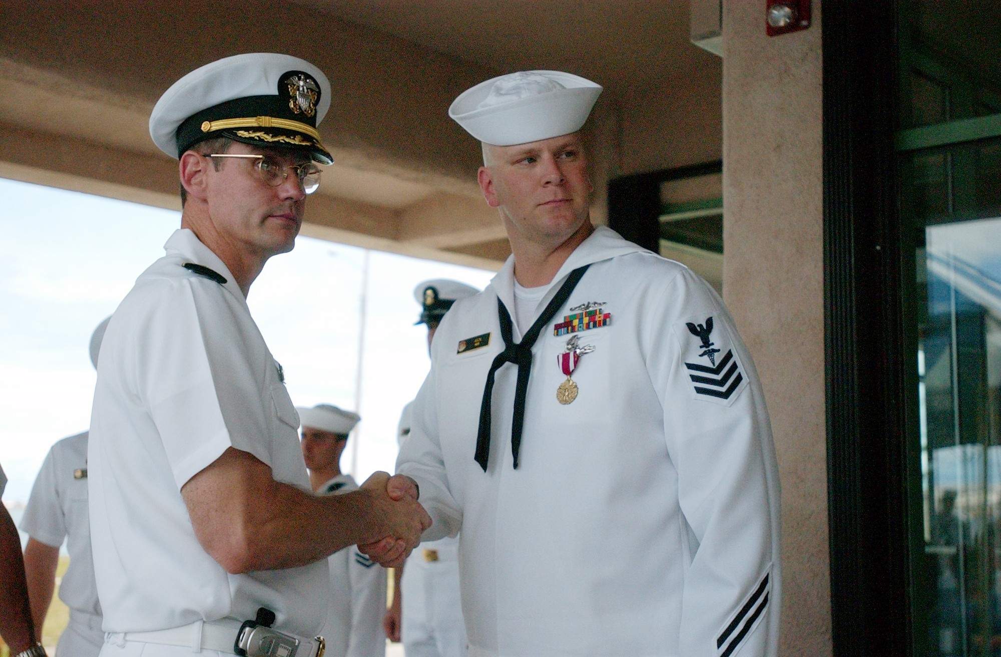![]() | 282k | Commanding Officer, Submarine Squadron Fifteen, Capt. Bradley R. Gehrke, shakes the hand of Hospital Corpsman 1st Class James H. Akin at an awards ceremony for Sailors assigned to the attack submarine San Francisco (SSN-711), at Polaris Point, Guam, 25 March 2005. The Navy awarded Petty Officer Akin the Meritorious Service Medal for administering emergency triage to 70 injured crew members over an intense two-day period aboard San Francisco after it grounded south of Guam, 8 January 2005. Akin organized the Crew's Mess into a makeshift emergency trauma center, prioritized medical care and rapidly stabilized two of the most seriously injured personnel. | USN photo # N-1906G-001 by Jesse Leon Guerrero, courtesy of news.navy.mil. | |