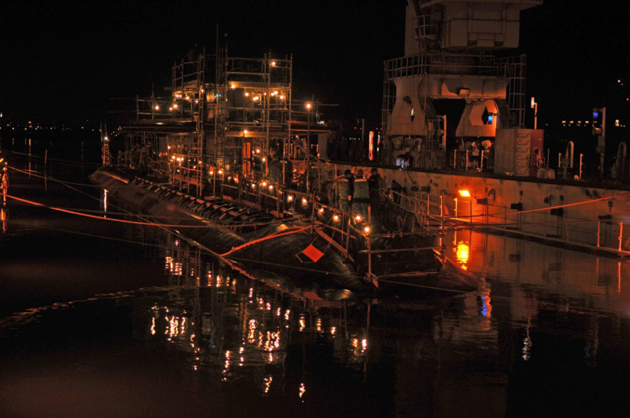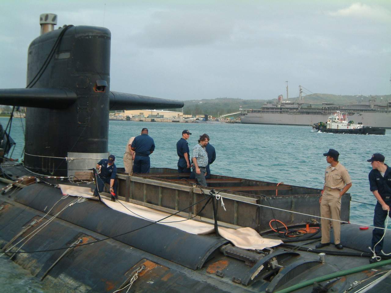![]() | 113k | Cofferdam topside of the attack submarine San Francisco (SSN-711) at her home port of Apra Harbor, Guam, following an incident in which it ran aground approximately 350 miles south of the U.S. territory on 8 January 2005. | USN photo courtesy of Ric Hedman TN(SS) Commander, Seattle Base USSVI. | |