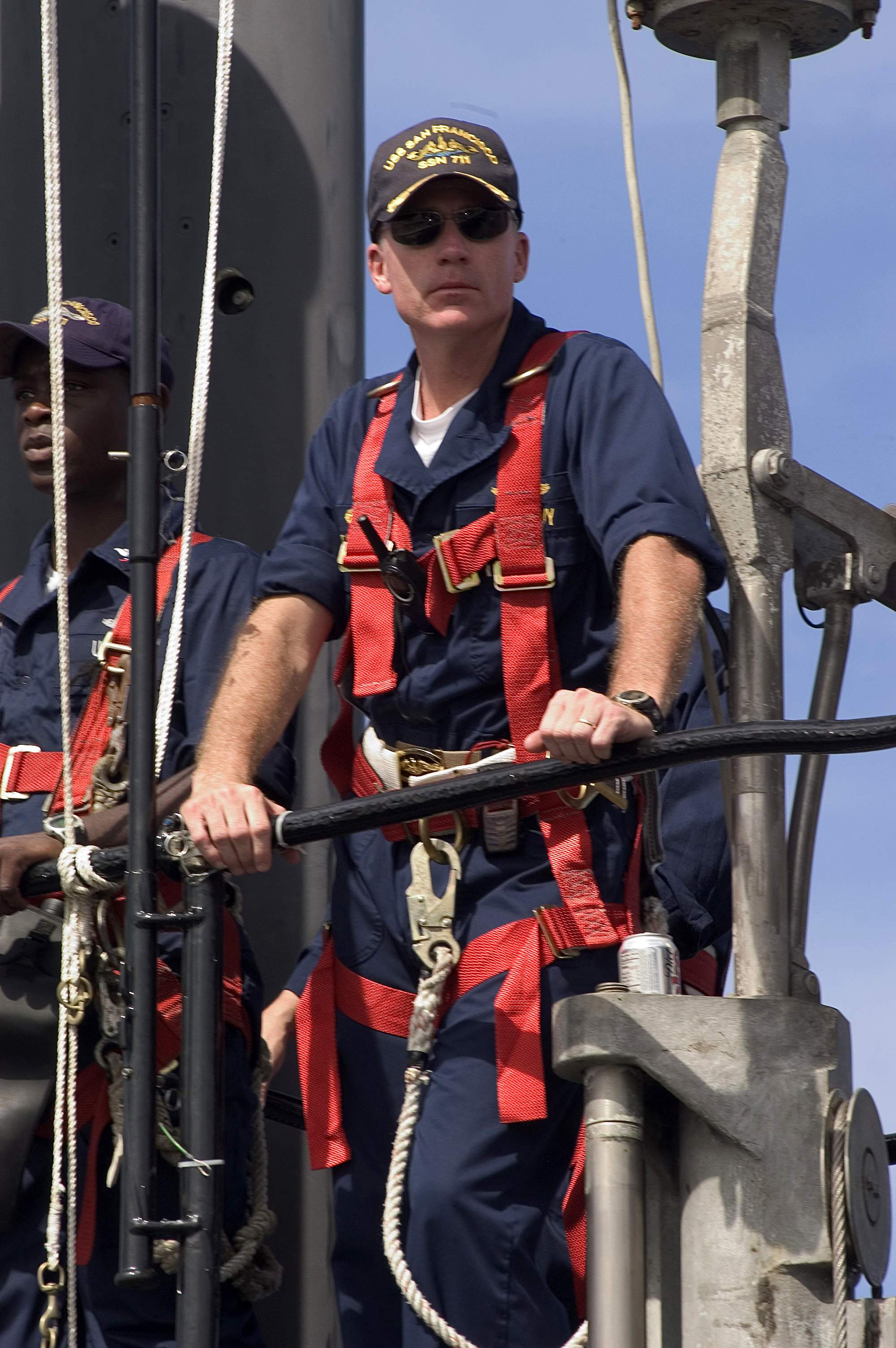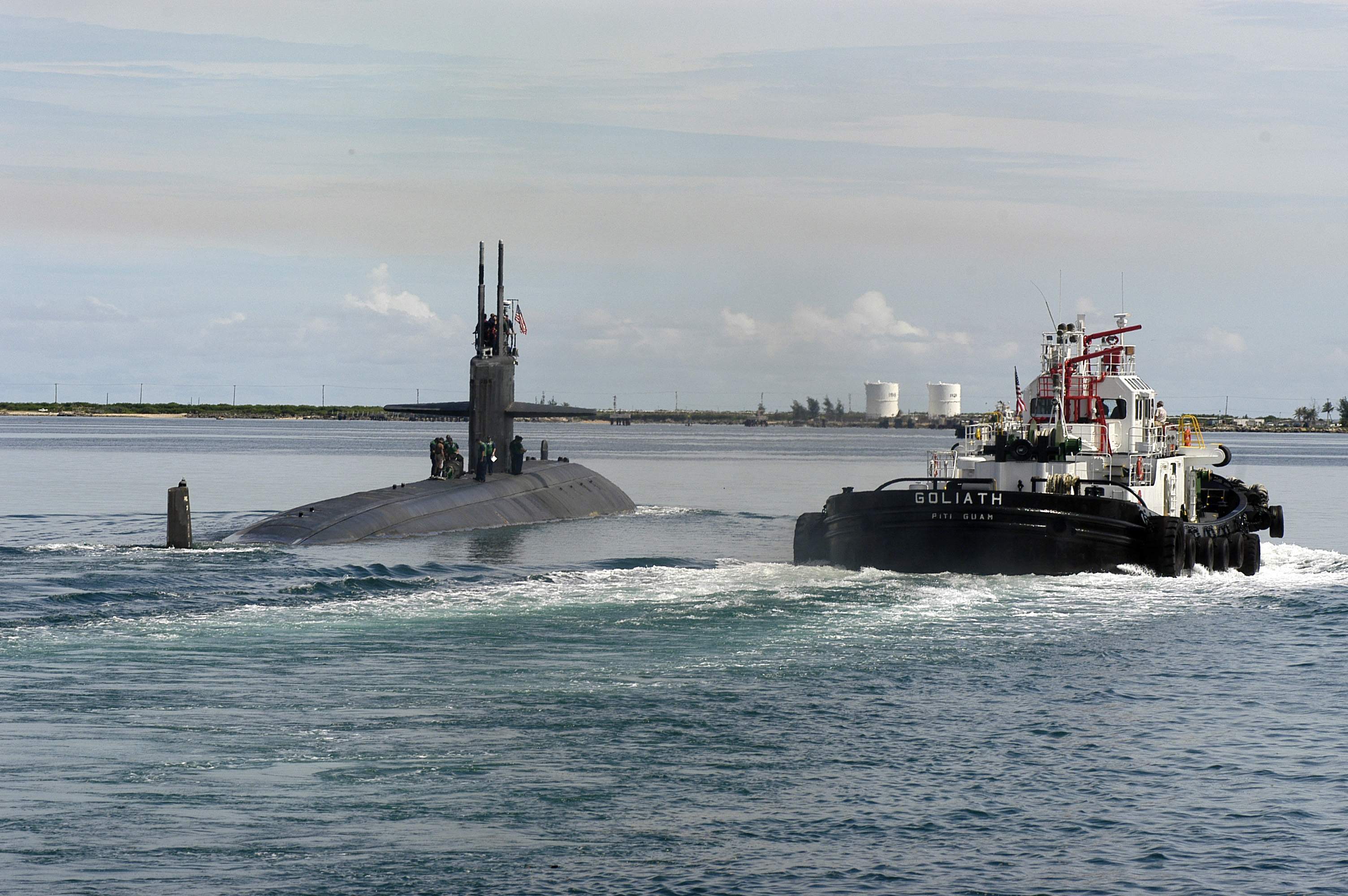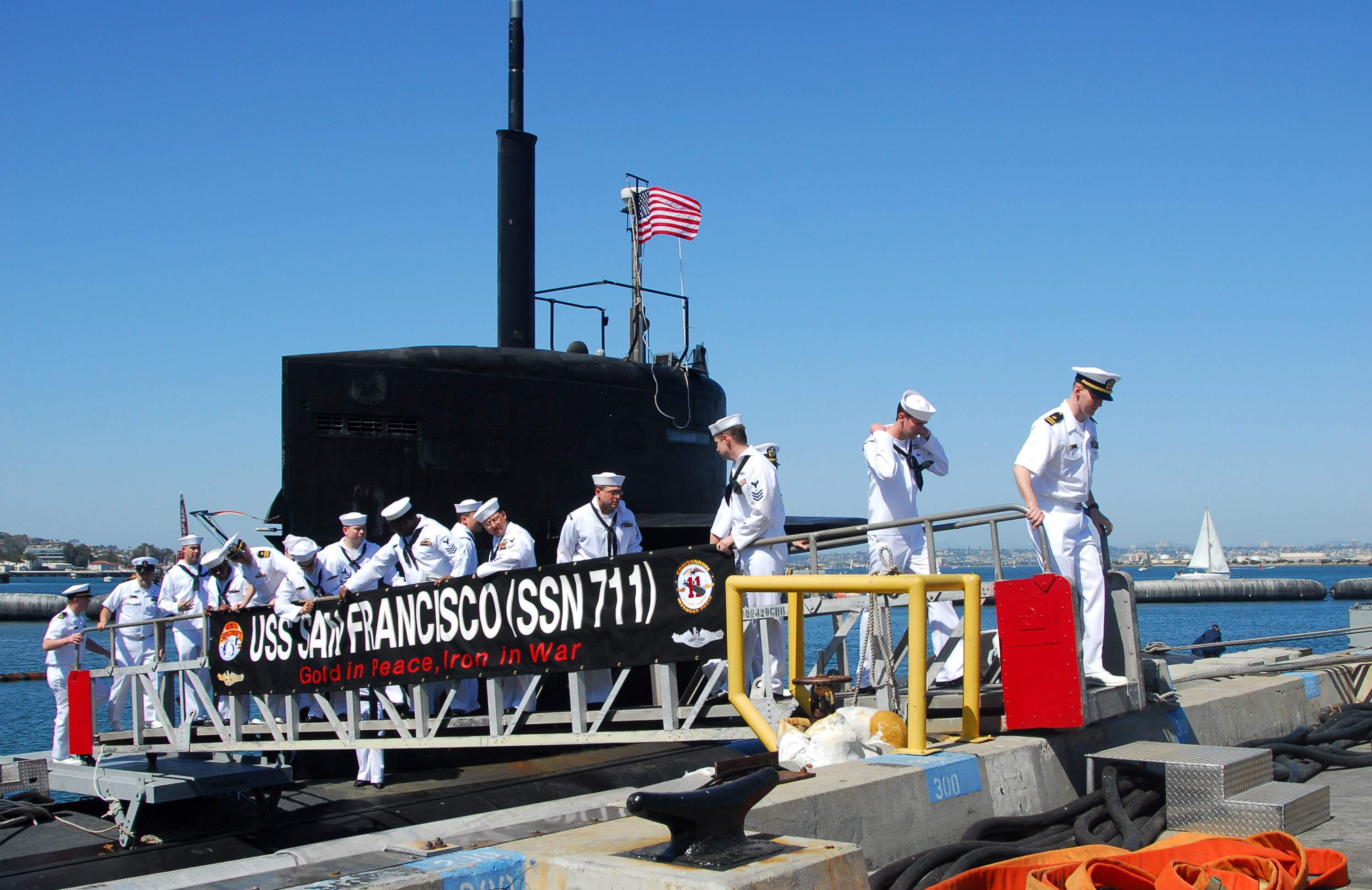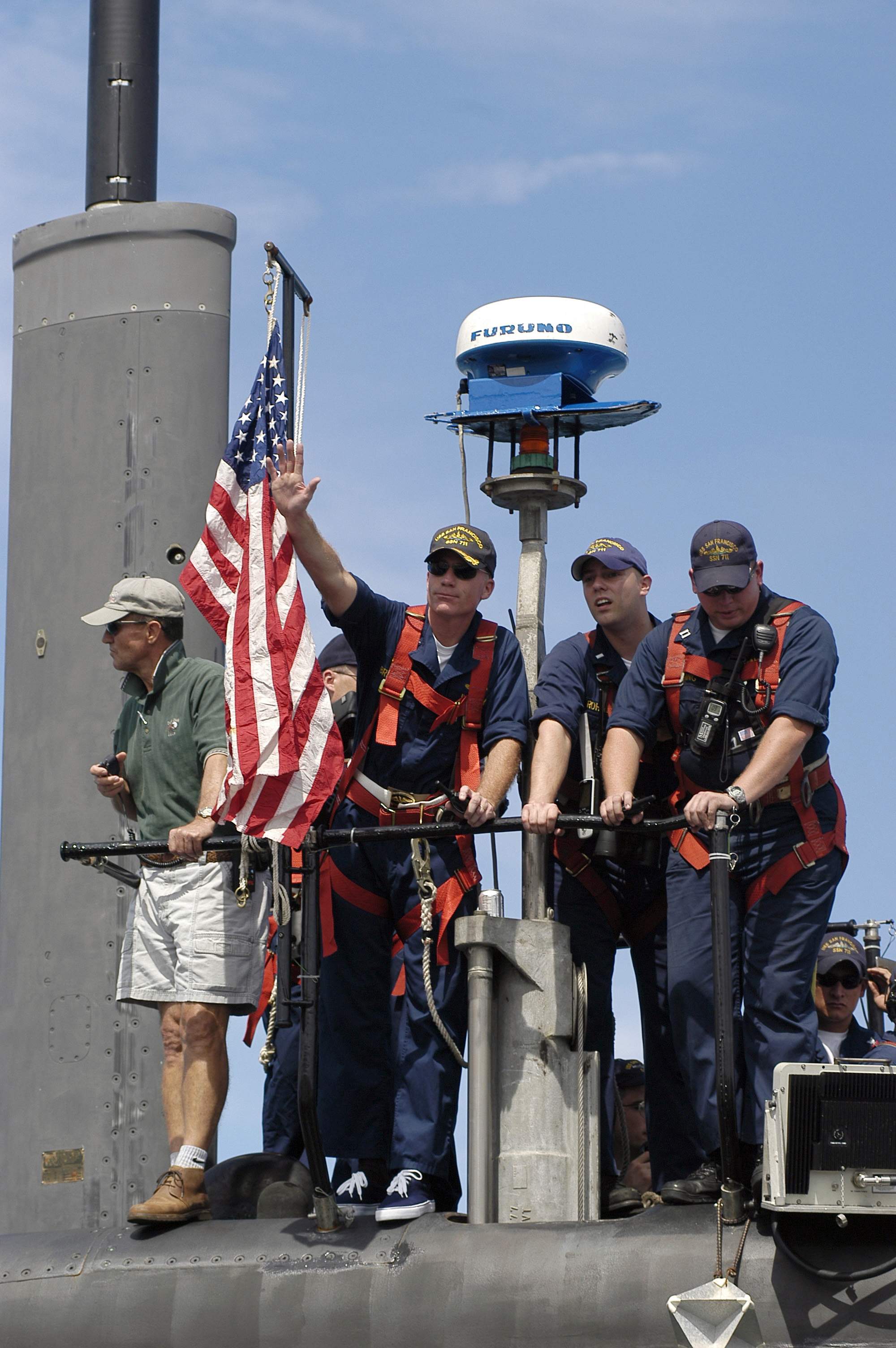 ![]() | 401k | The Commanding Officer, San Francisco (SSN-711), Cmdr. Kevin Brenton, waves farewell to the crowd on the pier as his attack submarine gets underway from Naval Base Guam. The submarine departed its former homeport of Apra Harbor, Guam, to make the journey across the Pacific Ocean to her new homeport of Bremerton, Wash. | USN photo # N-7293M-093 by Photographer's Mate 2nd Class Nathanael T. Miller, courtesy of news.navy.mil. | |
