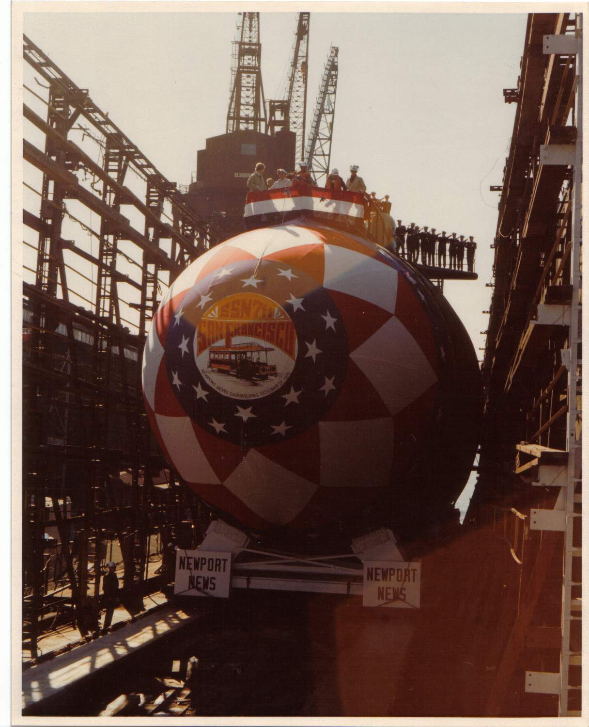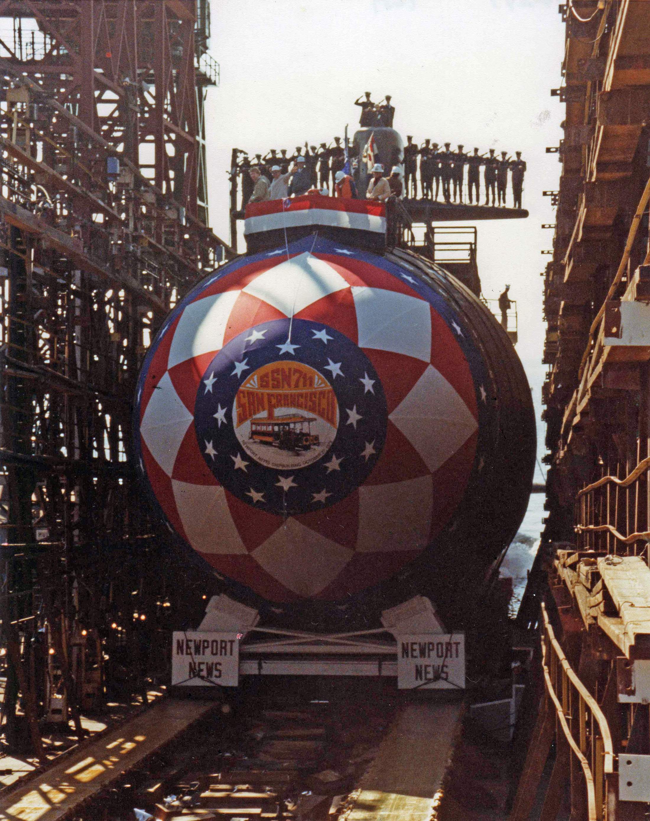 ![]() | 161k | The crew of the San Francisco (SSN-711) salute the national ensign on her launching day while on the ways at NNS&DD Co Newport News, Virginia, 27 October 1979. | Official USN photo courtesy of Robert M. Cieri. | |