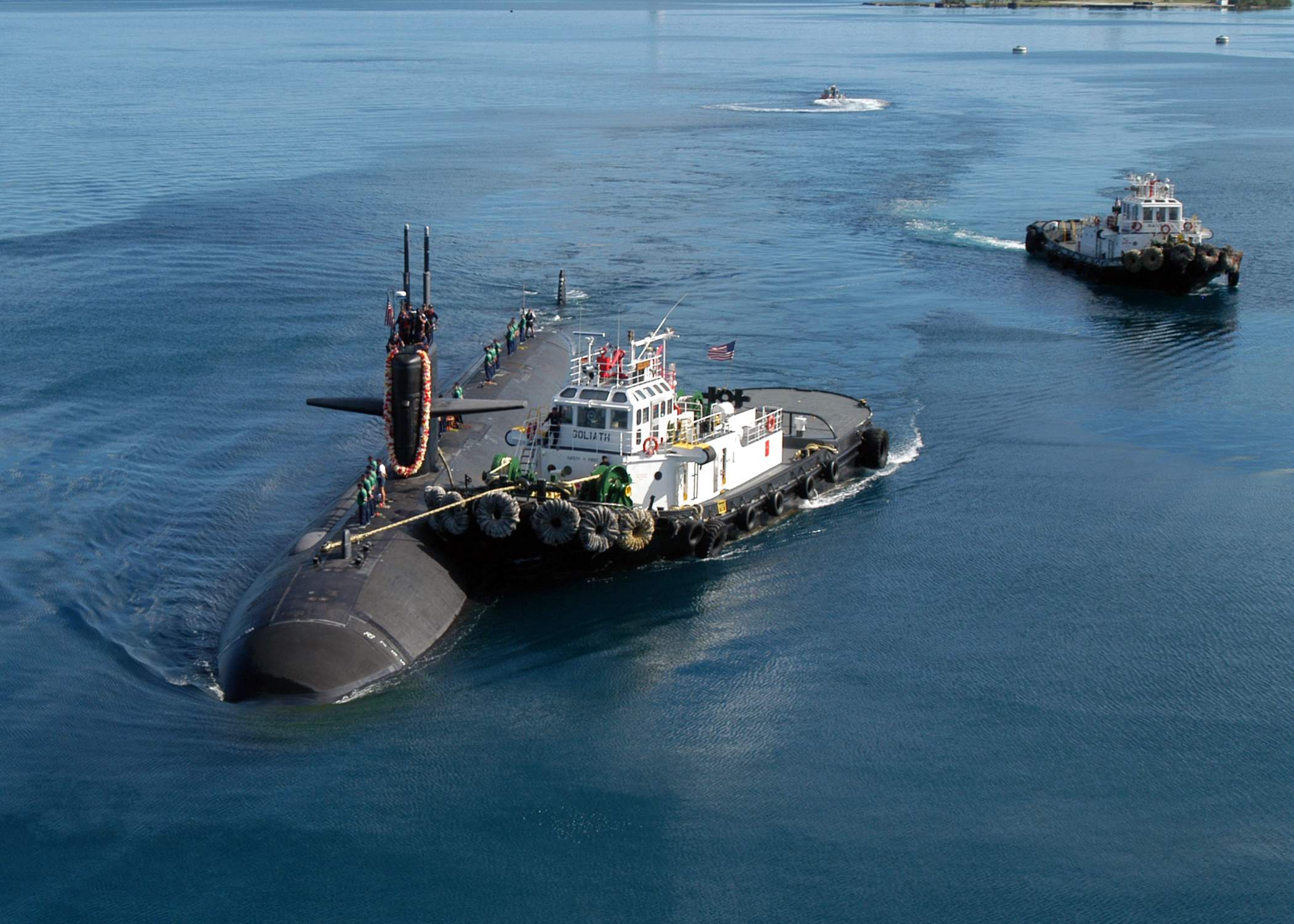 ![]() | 619k | Escorted by the tug Goliath, the attack submarine San Francisco (SSN-711) departs its former homeport of Apra Harbor, Guam, 17 August 2005 to make the journey across the Pacific Ocean to her new homeport of Bremerton, Wash. San Francisco was part of Submarine Squadron Fifteen operating from the Marianas Islands. | USN photo # N-7293M-111 by Photographer's Mate 2nd Class Nathanael T. Miller, courtesy of news.navy.mil. | |