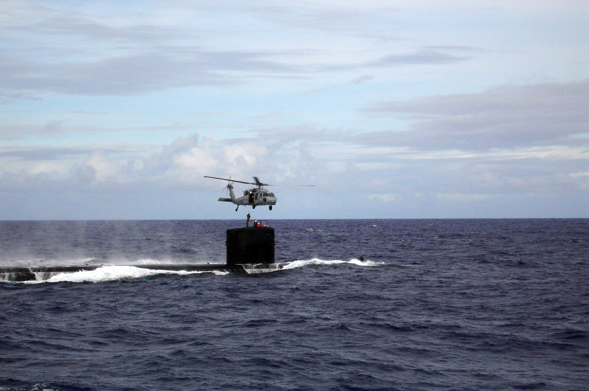 ![]() | 275k | An MH-60S Knighthawk helicopter, assigned to the "Providers" of Helicopter Combat Support Squadron Five (HC-5), transfers medical personnel on 9 January 2005 to San Francisco (SSN-711) located south of Guam, following an underwater collision, 8 January Medical personnel were rushed to the attack submarine once it was within range to assist the ship's independent duty Corpsman in providing urgent treatment to injured crew members. Regrettably, Machinist Mate 2nd Class Joseph Allen Ashley died soon after the medical team's arrival from massive head injuries.
