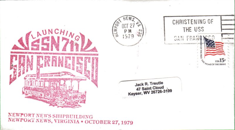 ![]() | 56k | Commemorative post mark on the occasion of the launching of the attack submarine San Francisco (SSN-711) at NNS&DD Co Newport News, Virginia dated 27 October 1979. | Courtesy of Jack Treutle (of blessed memory). | |